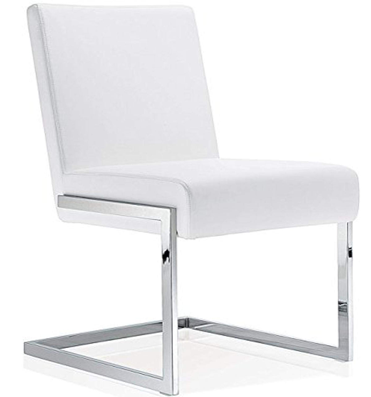 High-polished stainless steel sled base frame gives Toulon dining chair a striking silhouette and the feel is actually quite comfortable. Thanks to the extra thick cushion covered in durable white faux leather, Toulon dining chair will bring a sophisticated modern look to your dining room or kitchen space at an affordable price. The Toulan side chair is an elegant combination of modern design and comfort. Made in China, the dining chair requires assembly.