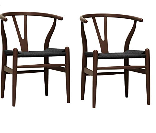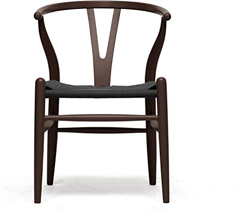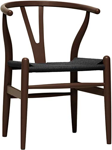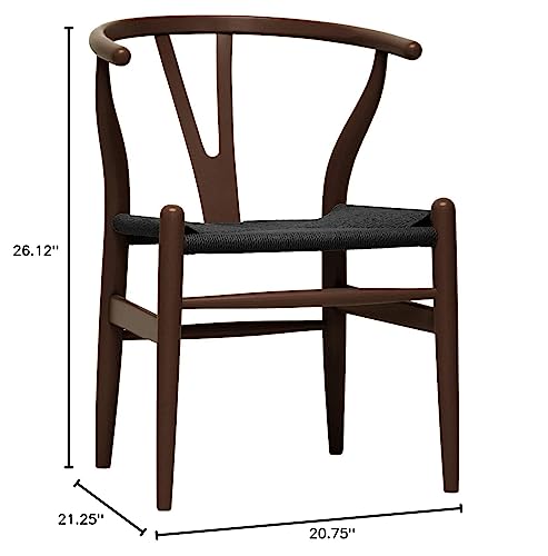 This mid-century dining chair features traditional wood and is paired with a modern form, resulting in a unique piece for your home. The frame consists of solid wood with a dark brown finish, a curved backrest, and sturdy black hemp seat. This is a quality reproduction of the Hans Wegner Wishbone Chair, which is also known as the Wegner Y Chair, Carl Hansen Wishbone Chair, CH24 Wishbone Chair, and the Wegner CH24. 'Dimensions: 20.75 inches wide x 21.25 inches deep x 26.125 inches high Seat height: 17.5 inches.