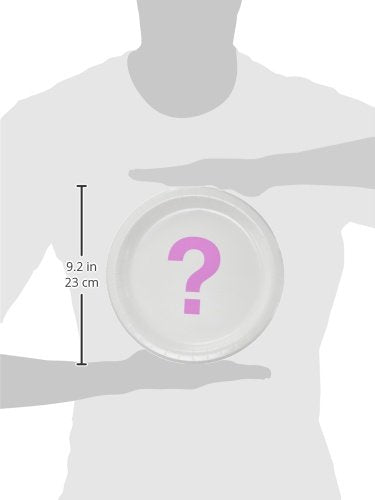 Team Pink Plates (8 Count). The package contains 8 pieces of white paper plates printed with a pink question mark. The plates measure 9 Inch. Use these plates for a baby shower or gender reveal party.