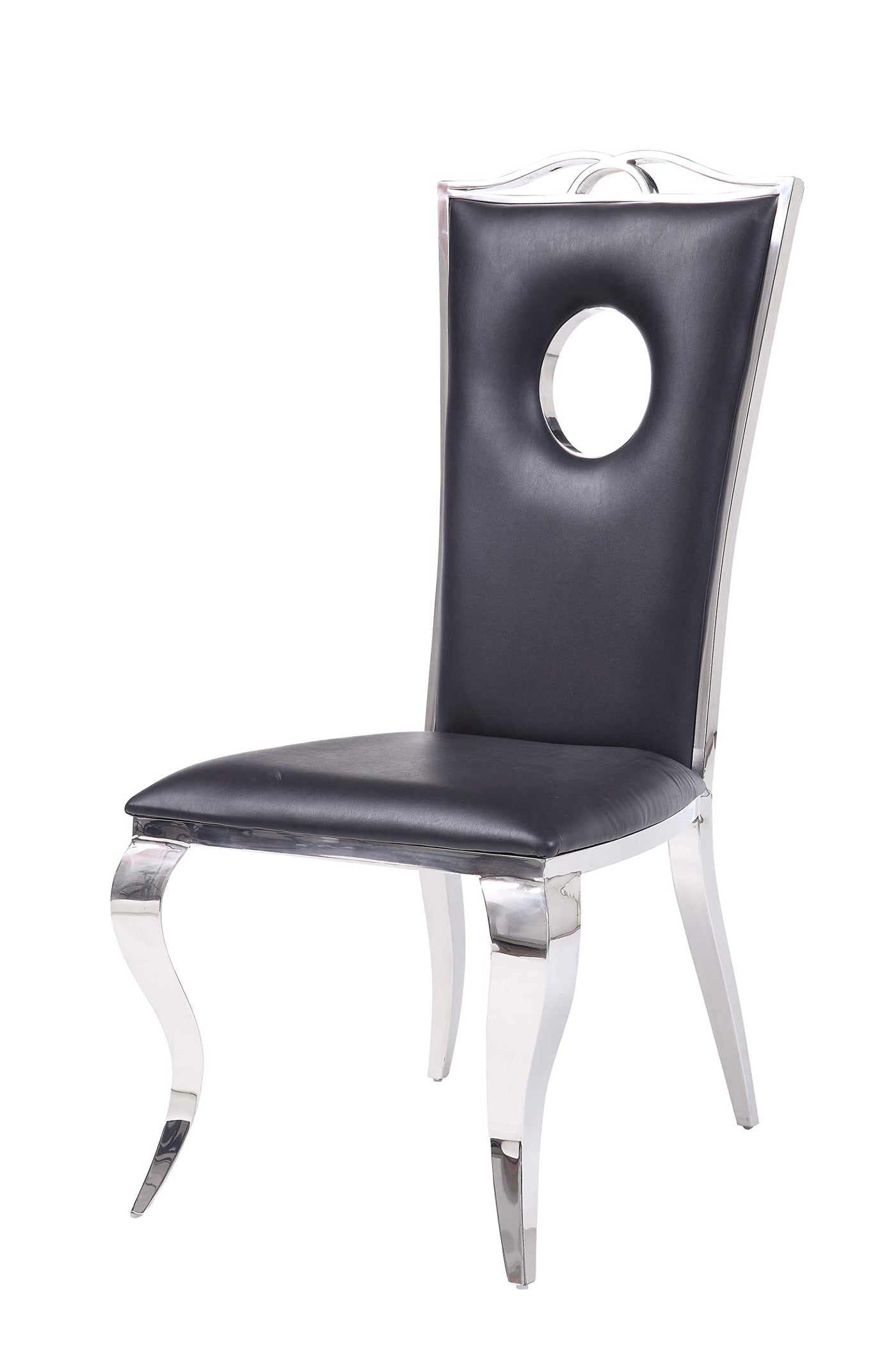 Add A Touch Of Sophistication To Your Dining Room Ensemble With This Two Side Chair Set. Upholstered In An Easy To Clean Black Vegan Leather, The Chairs Feature Modern Design With Elegant Crown And Oval Cutouts. A Stylish Silver Finish And Stainless Steel Cabriole Style Legs Make This Set Irresistible.