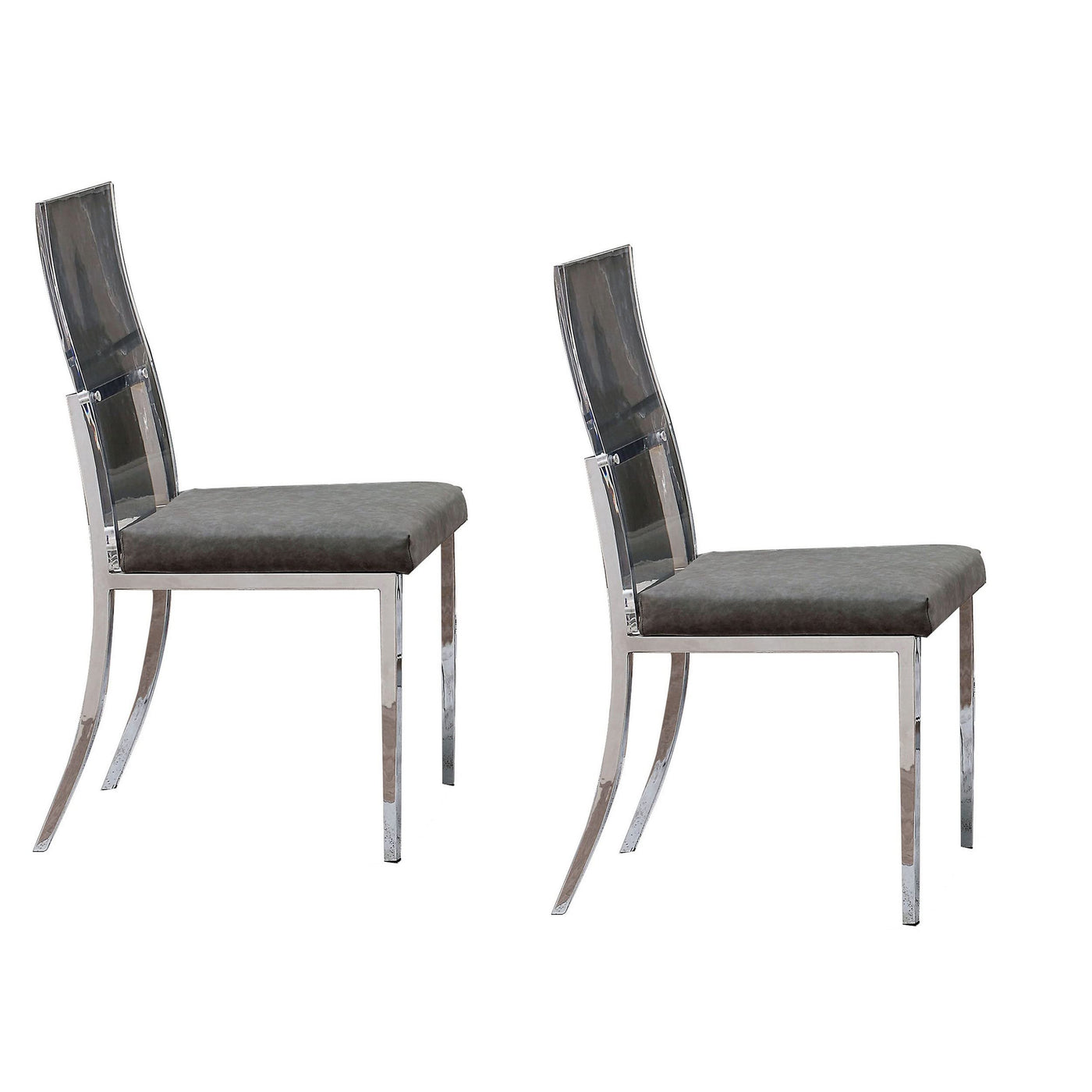 Bring A Contemporary Modern Design Into Your Dining Area With This Set Of Two Of Dining Side Chairs. Constructed From Metal This Chair Features A Gray Faux Leather Upholstered Padded Cushion For Cozy Seating, A Contrasting Silver Finished Metal Frame And A Sleek, Flared Acrylic Seat Back. The Armless Design Of This Chair Encourages Movement And Conversation, Making It The Ideal Option For Any Modern Dining Room Ensemble.