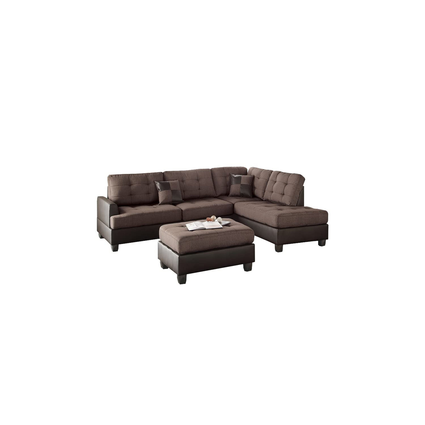 This 3 Pieces Sectional Features Modern Contemporary Styling Upholstered By Polyphaser Fabric. This 3-Piece Sectional Features Linen-Like Seating Framed In Dark Brown Faux Leather. Both Accent Tufting And Light Stitching Add To The Contemporary Style. This Sectional Also Includes A Matching Cocktail Ottoman. Chaise: 75' X 34' X 35'H Sofa: 70' X 34' X 35'H Ottoman: 35' X 24' X 19'H