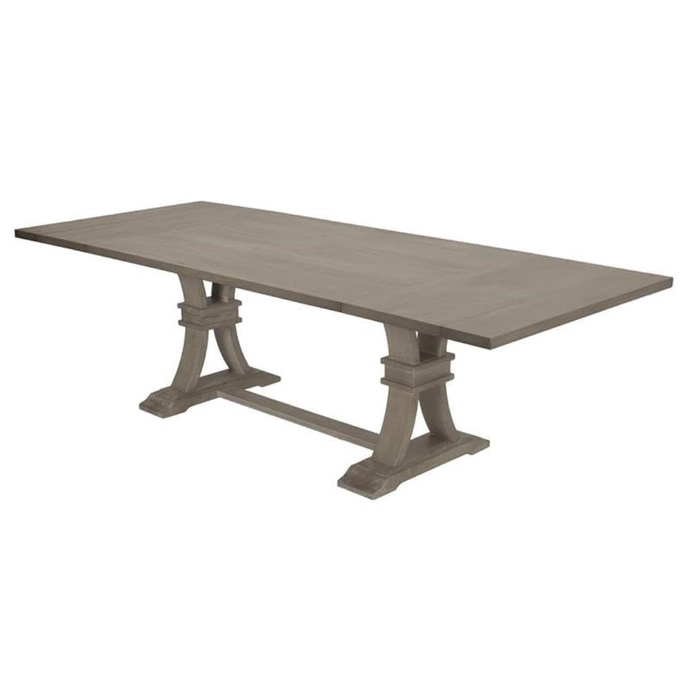 Set of 1 Table, 1 Bench and 5 Chairs. Anchor your dining space in clean, transitional style with this seven-piece dining set. Crafted of weathered oak in a gray finish, the tabletop strikes a rectangular silhouette measuring 30” H x 104" L x 42" W. An addition bench 18” H x 60” L x 17” W and two self-storing leaf 16” W provide extra comfortable and accommodates more guests. Two trestle-base legs for sturdy support. Rounding out the set, five matching 41. 25” H x 20. 5” L x 22. 25” W cushioned-seat, cappuccino, tufted-back chairs. Weight Capacity: 300 lbs. Please enjoy a nice casual dinner with friends using this seven-piece dining set. Weight Capacity: 300 lbs.