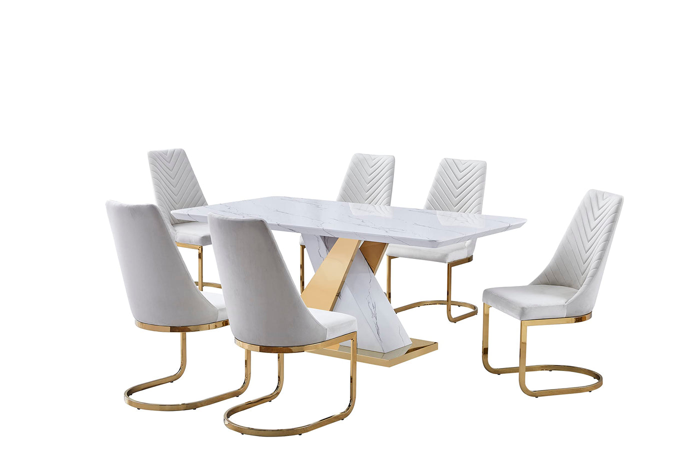 These dining sets are perfect for almost any household out there. The simplicity in the design of this set makes it easy to pair with other pieces of furniture. This beautiful set is available in multiple variations to cater to the different style dining rooms out there. The dining table has a faux marble tabletop along with a gold stainless steel crisscross base, The chair that is included with this set is in Cream Velvet with Gold Chrome Base. This set could be the missing pieces that you need to make your household feel like a home.