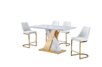 Modern / Contemporary Style | Faux Marble Table Top | Gold Color Stainless Steel Base | White Marble Color | Comes With White Faux Leather Counter-Height Dining Chairs With Gold Chrome Legs