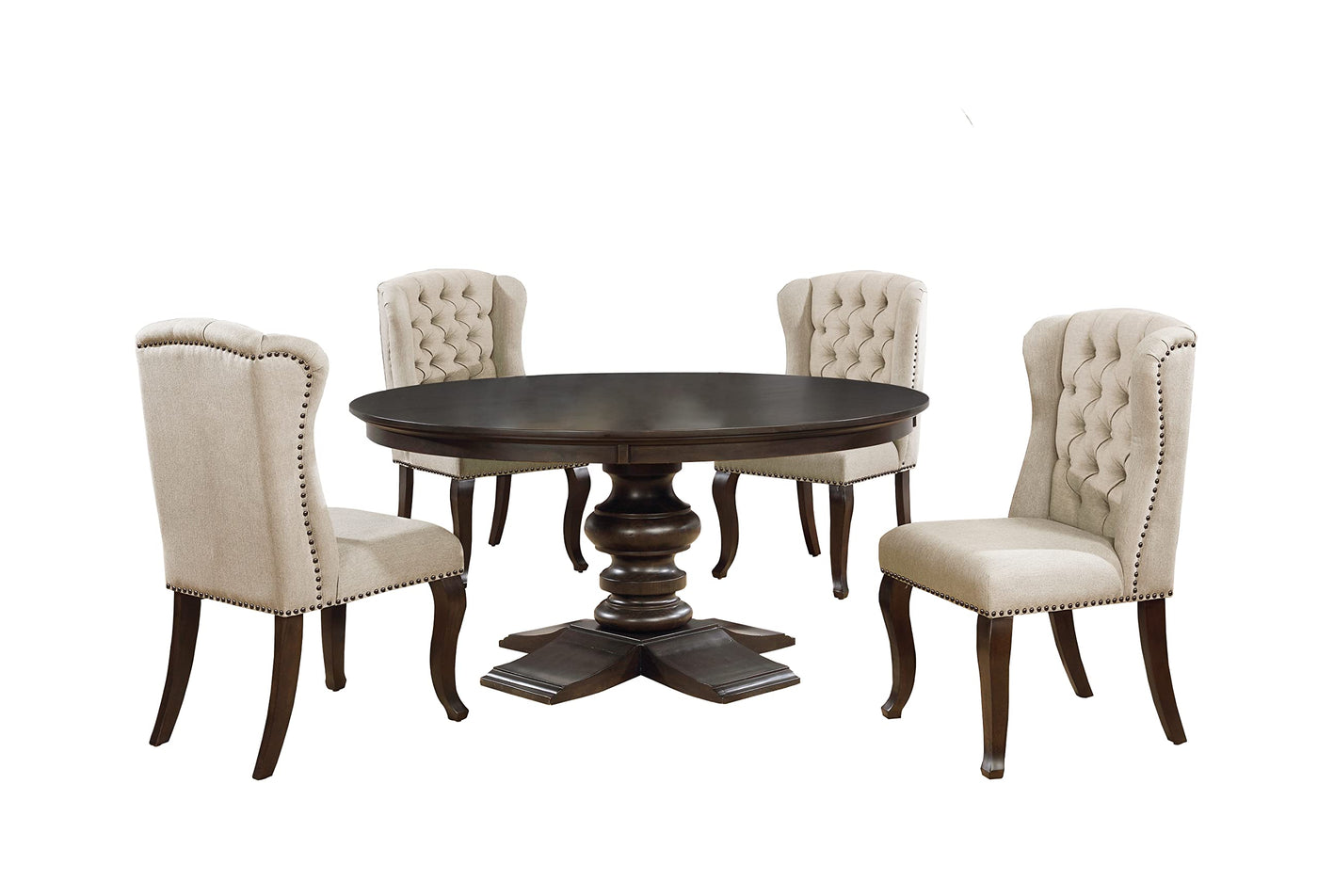 Stylize Your Dining Or Kitchen Area With This Striking Contemporary Set. Crafted Of Solid And Manufactured Wood. It Features A Round Tabletop, Pedestal Base And Four-Side Chairs With Elegant Beige Or Cappuccino Finish. Gather Up To Four Friends And Enjoy A Nice Casual Dinner Or Tea Time With This Dining Set. 1 Table: 30” H X 54” L X 54” W And 4 Chairs: 40” H X 21” L X 25” W. Weight Capacity: 300 Lbs. Assembly Is Required.