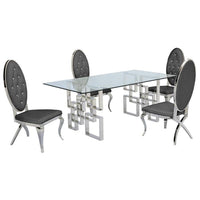 Create An Ultimate Functional And Stylish Dining Room With The Rectangle Glass Table Dining Set. This Special Dining Set Was Designed From The Ground Up To Add A Sophisticated, Contemporary Touch To Your Dining Room. The Table Of This Set Features A Rectangle Glass Table Top And Silver Color Stainless Steel Frame And Base Which Provide Better Support, Ensuring Longevity, Strength And Beauty. Dining Chairs Are Upholstered In 4 Colors Options: White Faux Leather (Sc60), Gray Velvet (Sc161), Black Velvet (Sc162), Or Teal Velvet (Sc163) Fabric. Features: Includes One (1) Dining Table, And Four (4) Dining Chairs Contemporary / Glam Style Glass Table Top Silver Stainless Steel Framing Materials: Stainless Steel, Glass, Velvet Fabric. Sturdy Build Construction Chair Color: Gray Velvet Dimensions (Height X Length X Width): Dining Table: Overall: 46 Inches H X 23 Inches H X 21 Inches W Chair: Overall: 46 Inches H X 23 Inches H X 21 Inches W