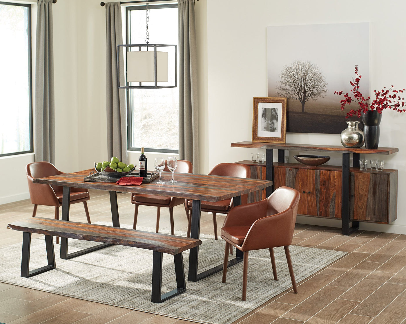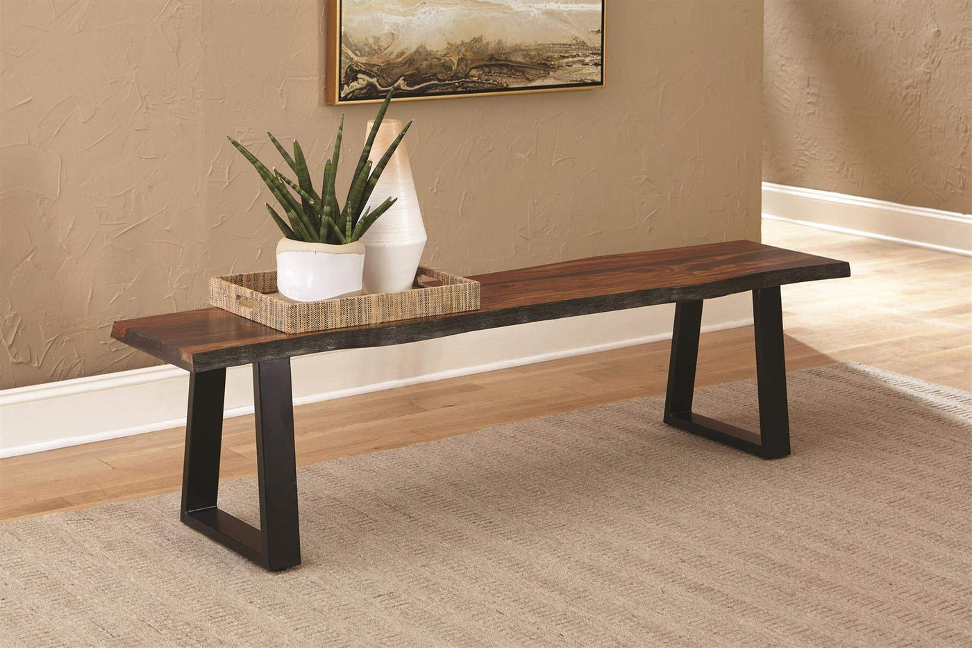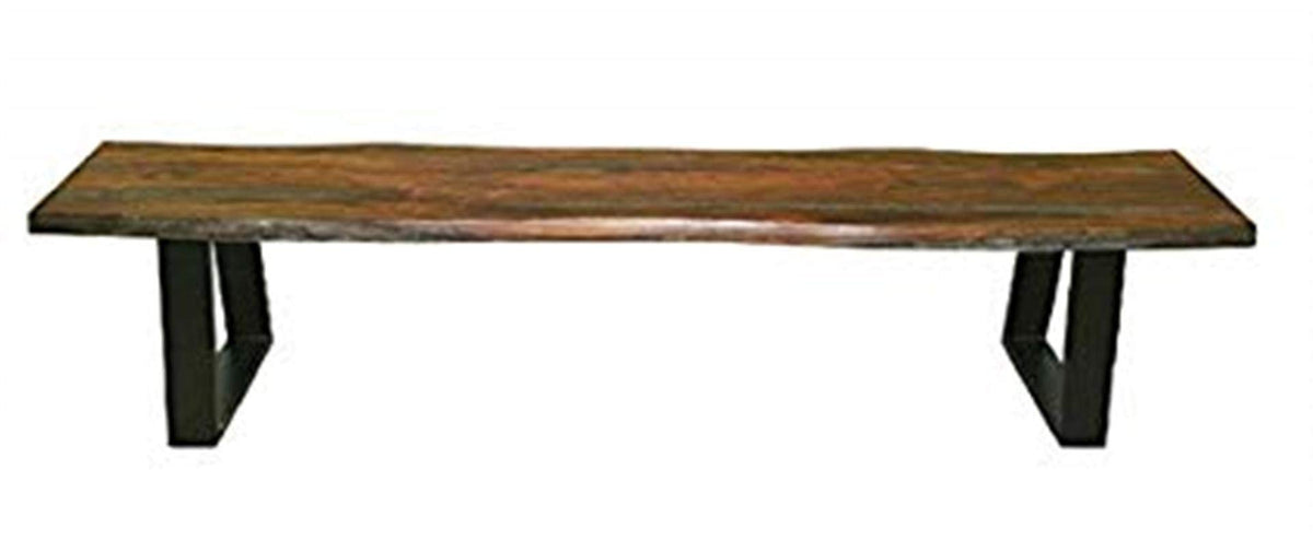 Inspire a casual, inviting aura with the addition of this rustic wood dining bench. Resting on a pair of angular metal braces, the bench features a 70-inch long backless seat. Just right for seating two to three of your favorite friends or family members. Perfect for contemporary or industrial spaces, the bench boasts a black metal finish to beautifully accentuate a gray shishum wood finish on the seat. Add an element of earthy appeal to any dining space.