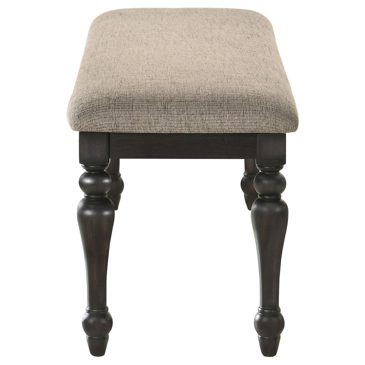 Instill casual elegance at a dining table or bring a refined touch to your entryway with a traditional backless bench. Its streamlined silhouette is accentuated with beautiful turned legs, offering classic character and dimensionality in any room. The versatile design features a charcoal gray sand-through wood finish that creates depth and richness. Its seat boasts comfortable and supportive foam cushioning. Brown upholstery is soft and multi-tonal to create a dimensional look and feel that blends in virtually any surrounding color scheme.