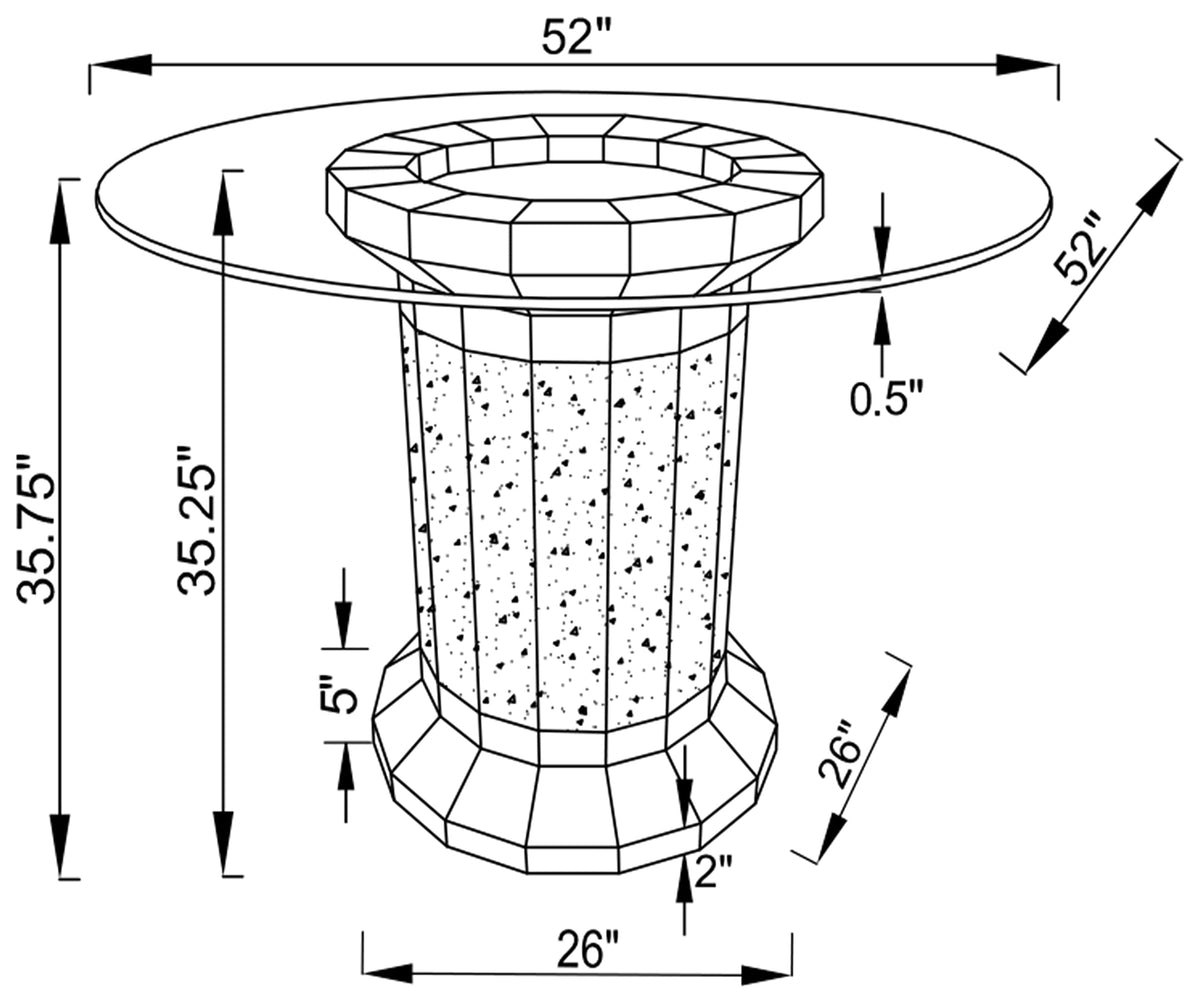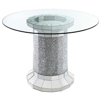 Host a small party at this modern glam counter height table. Designed in a column-inspired pedestal frame, this round table offers a sleek, classical aesthetic to your dining room or entertainment area. A sparkling faux diamond inlay mesmerizes and scintillates, creating a spectacular luxe expression. Around the flush base and top edges of the pedestal base is a mirror tile pattern that reflects the surrounding color palette. A round clear glass tabletop seats four to six guests effortlessly.FeaturesRound clear glass tabletop offers an open, airy feel Column-like round shaped pedestal base offers a classical elegance Glittering faux diamond acrylic inlay presents a luxurious accent and sparkle Mirror tile trim encompasses the surface for a highly reflective frameDimensions:Dining TableAssembled Product: 52 inches wide x 52 inches deep x 35.5 inches high Weight Capacity: 300 poundsAt Coaster, we are your premier source for exquisite furniture, offering diverse styles to enhance every aspect of your life. Our passion for excellence drives us to innovate, crafting budget-friendly furniture that complements your lifestyle. Explore our brands for endless design inspiration and make your living experience exceptional with thoughtfully designed, affordable pieces that inspire a life well-lived.