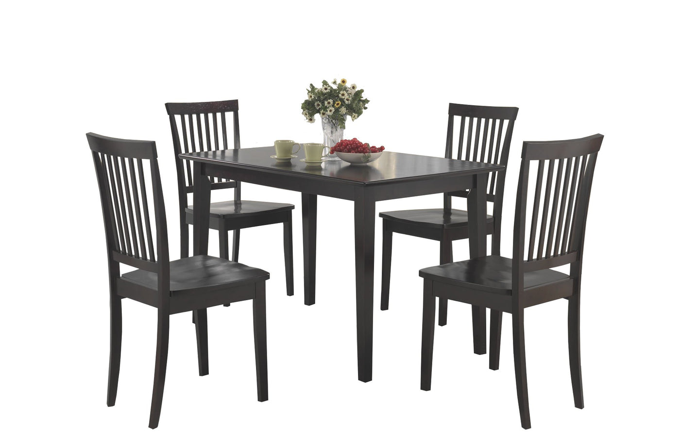 Go all-in on a classic motif with this five-piece dining set. Full of clean lines, the table features a rectangular silhouette with straight edges and square tapered legs. Elegant in style, the side chairs are complete with vertical slat backs that honor timeless design. Contoured wooden seats help to create comfort. Rich and warm, the cappuccino finish puts the finishing touch on a traditional dining room.