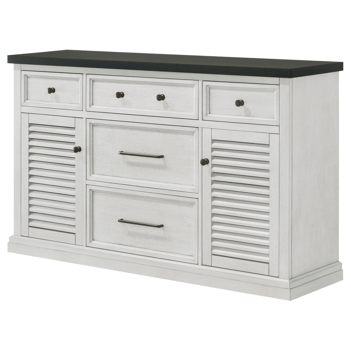 Includes: One (1) sideboard | Modern farmhouse character infuses a louvered sideboard to create stylish storage | Features a two-tone finish with a charcoal sand-through wood grain finish on top | Vintage chalk finish white base offers classic character with plenty of depth and dimension | Includes five felt lined drawers of varying sizes to accommodate all manner of necessities
