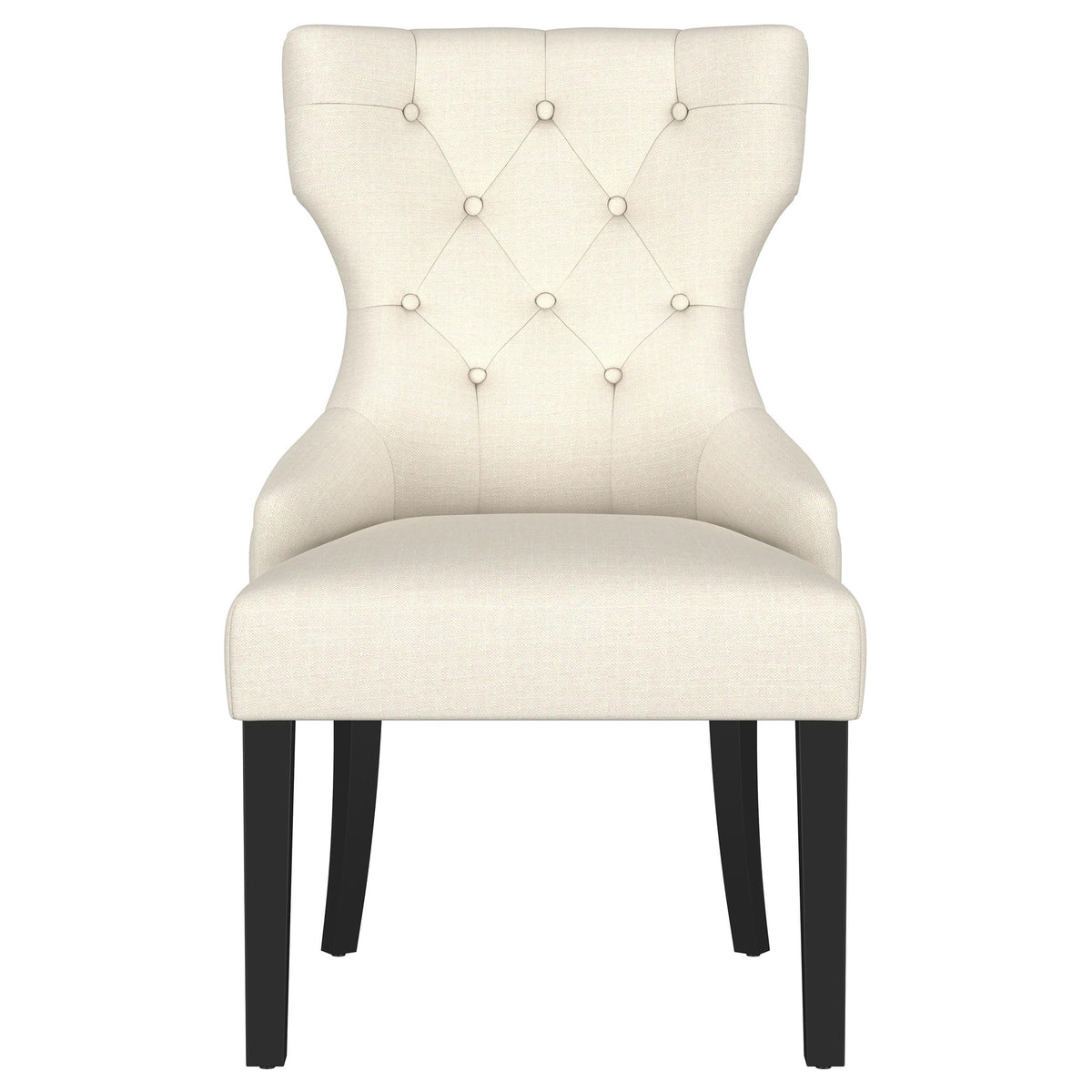 Create an exceptional, inviting dining room space with a modern button tufted dining chair. It pairs a classic wingback profile with a gentle curvature, offering impeccable comfort and chic style. Its plush back and seat feature foam cushioning with soft upholstery, delivering indulgent seating experiences to all who dine at your table. The back of the chair includes nailhead trim that adds a dimensional finishing touch. Black finish legs complete the look with austerity and excellent support.