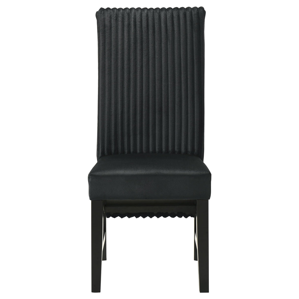 Includes: Two (2) side chairs | Black wide channel corduroy upholstery on the seat back adds texture and visual interest | Velvet fabric on the seat ensures a soft and luxurious seating experience | Sturdy black-finished wooden legs provide reliable support and durability | Sleek, modern silhouette perfect for a variety of dining room styles | Ideal for both formal and casual dining settings