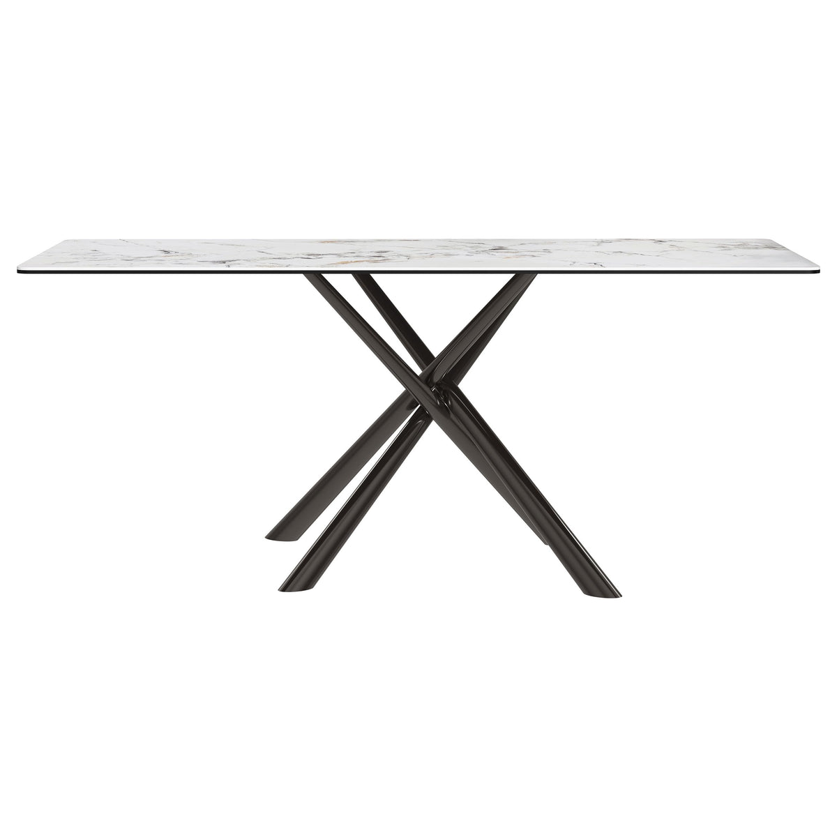Gorgeous sintered stone brings depth and dimensionality to a modern rectangular dining table. A true centerpiece in your kitchen or dining room, it boasts an enchanting white mirage finish on its tabletop, offering multi-tonal allure with a hint of glam. The modern design includes a bold sculptural base that provides support with its starburst motif. The base receives a glossy black finish, offering a slick, sophisticated touch of sculpted elegance. Choose seasonal or timeless table linens and enjoy delicious meals with family and friends.