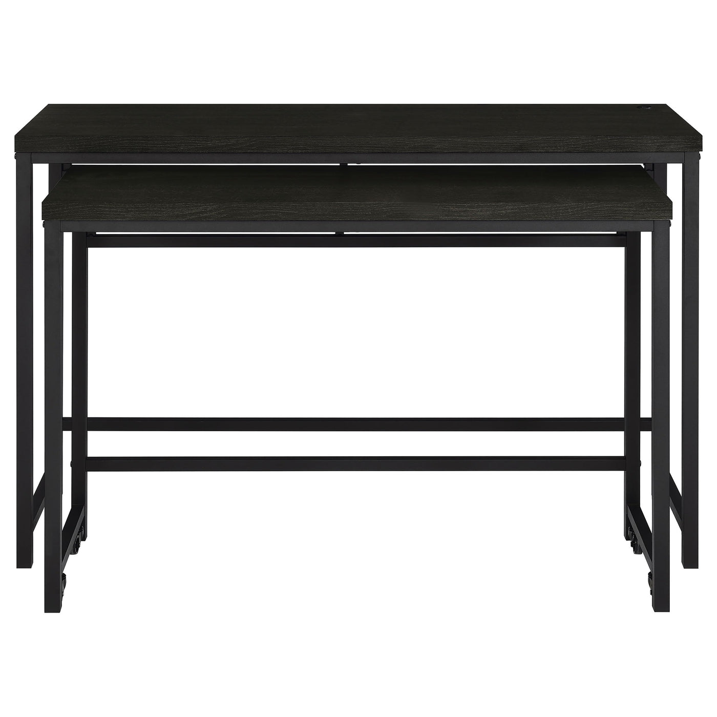 Includes: One (1) large table, one (1) small table, and two (2) stools | A modern four-piece counter height set with two tables and two stools is perfect for multi-functional spaces | Open framework in black finish with matching tabletops for a cohesive, seamless look | Two tables feature one small and one large table for easy configurability and versatility | Two stools are backless, with black finish bases and faux leather upholstery over foam padding | Smaller table is on wheels and nests under the larger, which includes a USB port in the tabletop