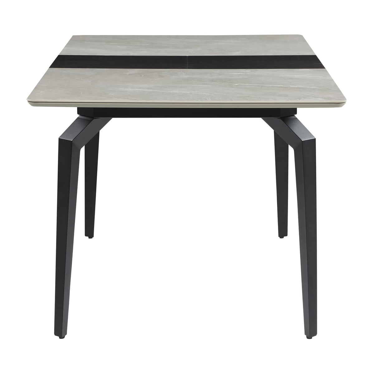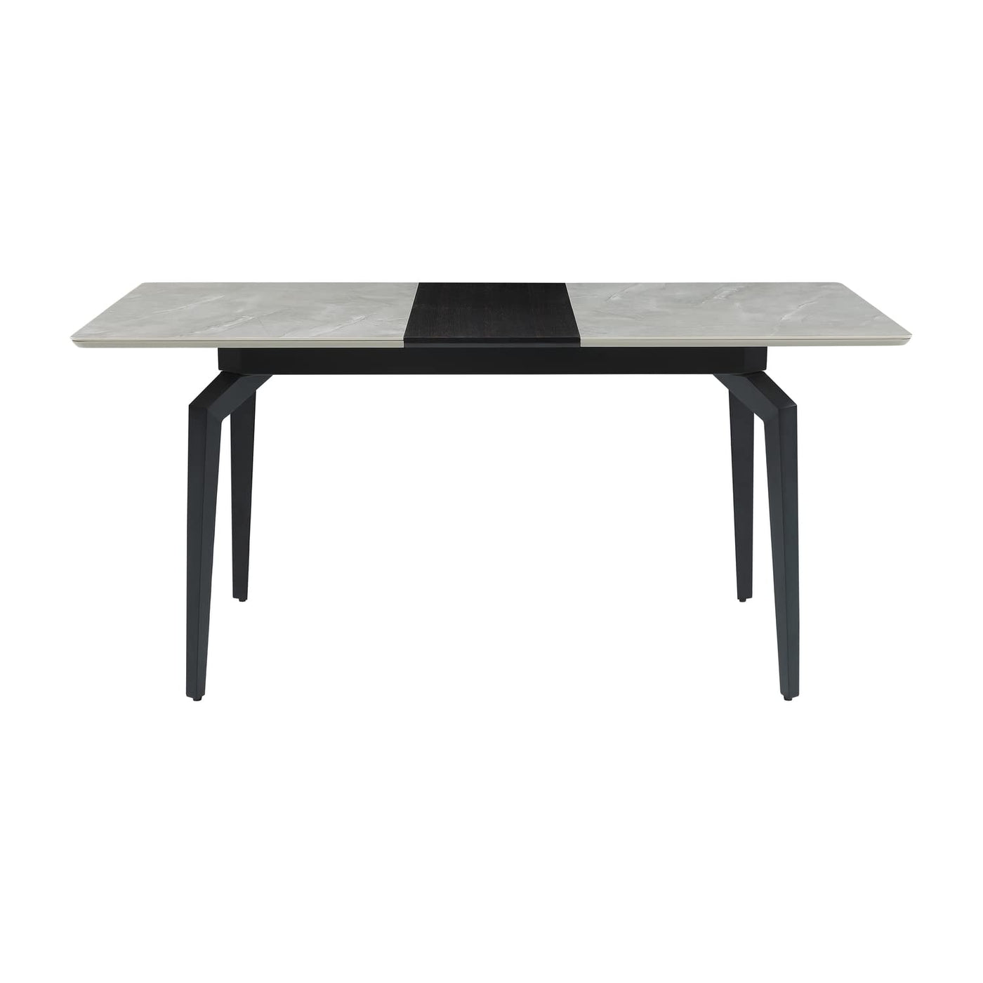 Sleek lines and sharp angles come together to create this elegant modern dining table. Designed with a gray ceramic tabletop designed to resemble marble, this dining table offers a strong and stable surface for entertaining guests. A self-storing butterfly leaf mounted on smooth metal glides lends additional space for extra guests too. Beveled edges and rounded corners soften the look of the stark lines of contrasting finishes. Long legs in a sandy black finish jut out from the top, offering a striking visual interest.