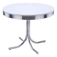 Retro style is back with this round dining table. Table rim and legs are chrome plated, perfect for a room with retro feel. Legs curve out into a base that's distinctively styled. This table is at home with juice and scrambled eggs as it is with poker and chips. Matching chrome plated chairs (not included) come with a black or red cushion to keep the vibe going.FeaturesRetro chrome plated tables display iconic styling of mid-century diners Tables feature a white top and chrome rimmed apron Choose from oval shaped or round shaped tables with curvaceous metal legsDimensions:Dining TableAssembled Product: 42 inches wide x 42 inches deep x 30 inches high Weight Capacity: 300 poundsAt Coaster, we are your premier source for exquisite furniture, offering diverse styles to enhance every aspect of your life. Our passion for excellence drives us to innovate, crafting budget-friendly furniture that complements your lifestyle. Explore our brands for endless design inspiration and make your living experience exceptional with thoughtfully designed, affordable pieces that inspire a life well-lived.