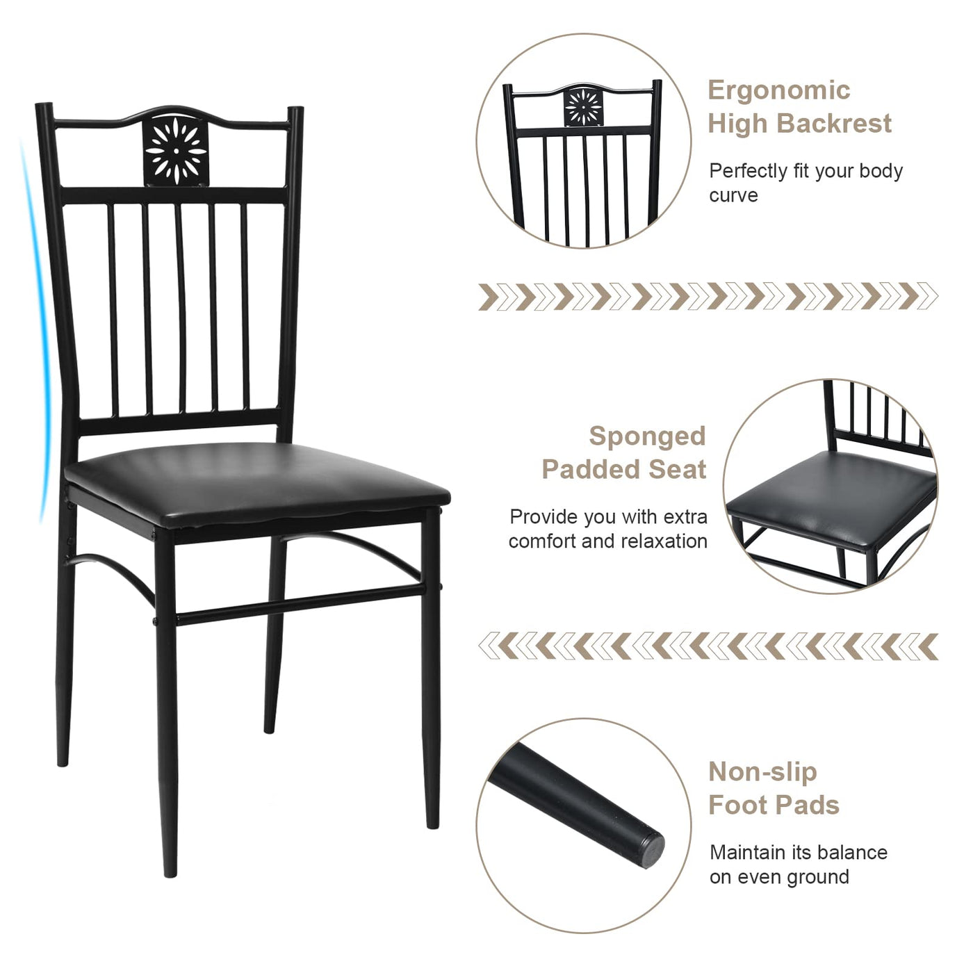 Features: The set comes with 1 rectangular table and 4 matching chairs 4 person can sit comfortably around the table Spacious tabletop provides ample space for snacks, drinks, etc Ergonomic high backrest perfectly fits body curve Thick padded seat for comfortable sitting experience Heavy-duty steel frame features high strength and long-lasting use Round corners reduce the risk of accidental injury Delicate cutout pattern complement to home decoration Suitable for dining room, kitchen, pub, restaurant, coffee shop, etc Easy to assemble under the guidance of instruction