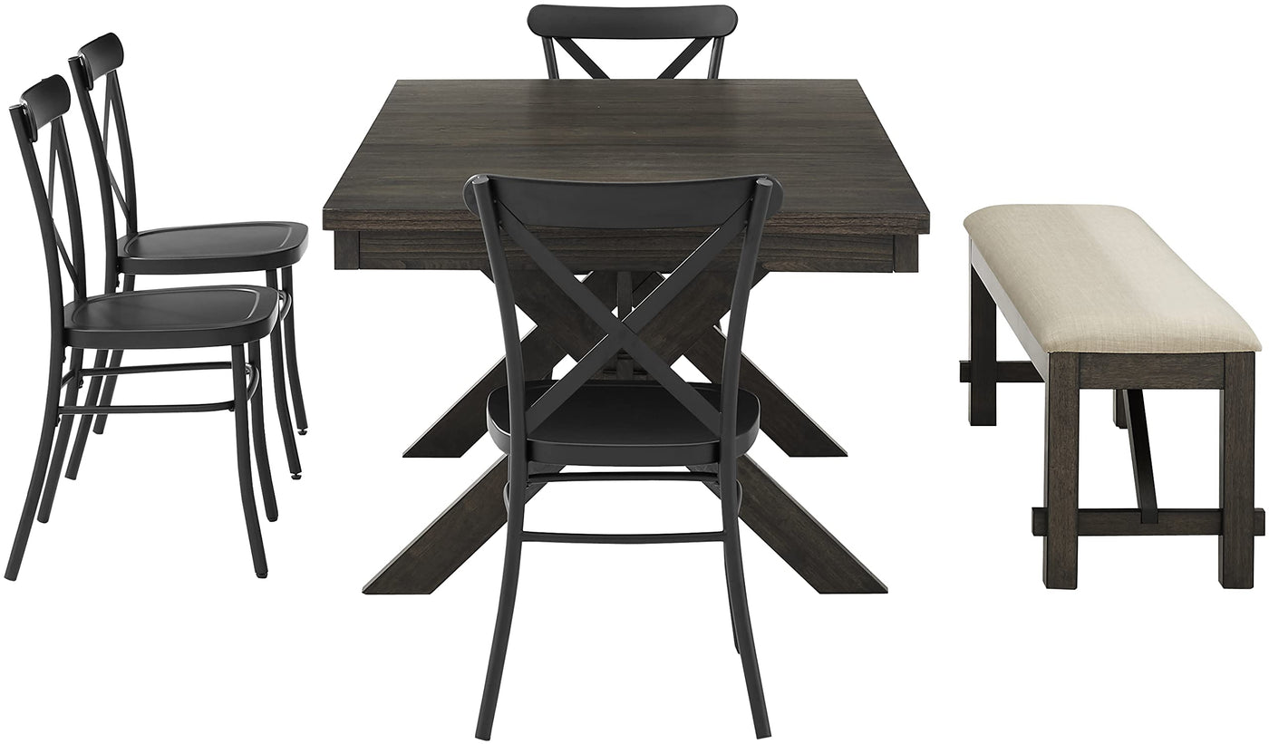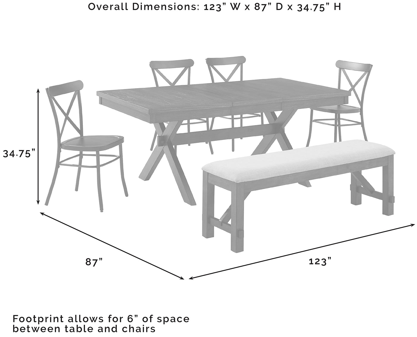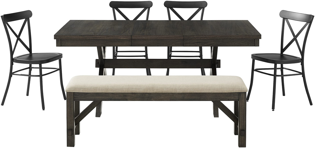 Bring modern farmhouse style to family gatherings with the Hayden Dining Set with Camille Chairs. Blending rustic wood and sturdy steel, this set features an extendable table with an 18” leaf surrounded by a coordinating bench and four all-metal x-back dining chairs. Beautifully crafted with X-shaped legs, the table's trestle base makes the Hayden 6-Piece Dining Set a timeless centerpiece for your dining room.