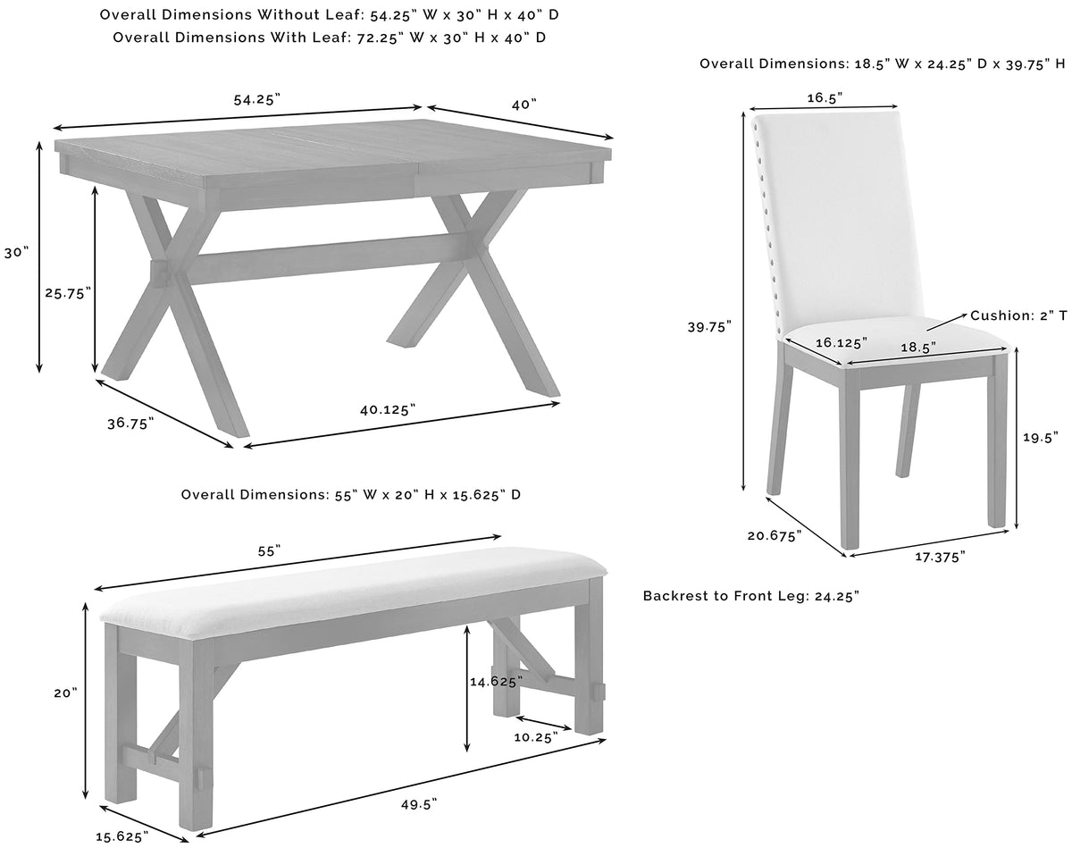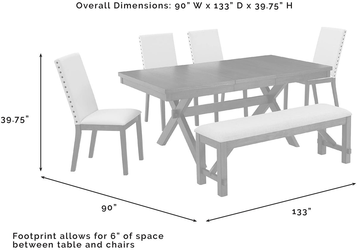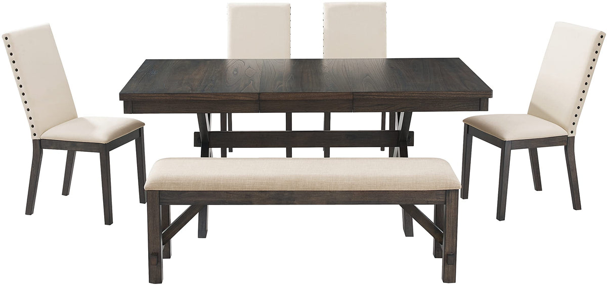 The Hayden 6-Piece Dining Set brings rustic elegance to family gatherings. Featuring X-shaped legs and a trestle base, the farmhouse table pairs beautifully with the bench and Parsons style dining chairs. The extendable table's 18” leaf offers space for six diners, making the Hayden 6-Piece Dining Set a timeless centerpiece for your dining room.