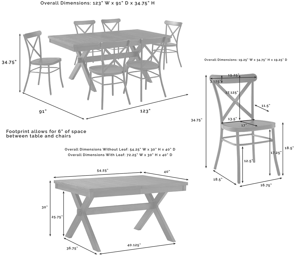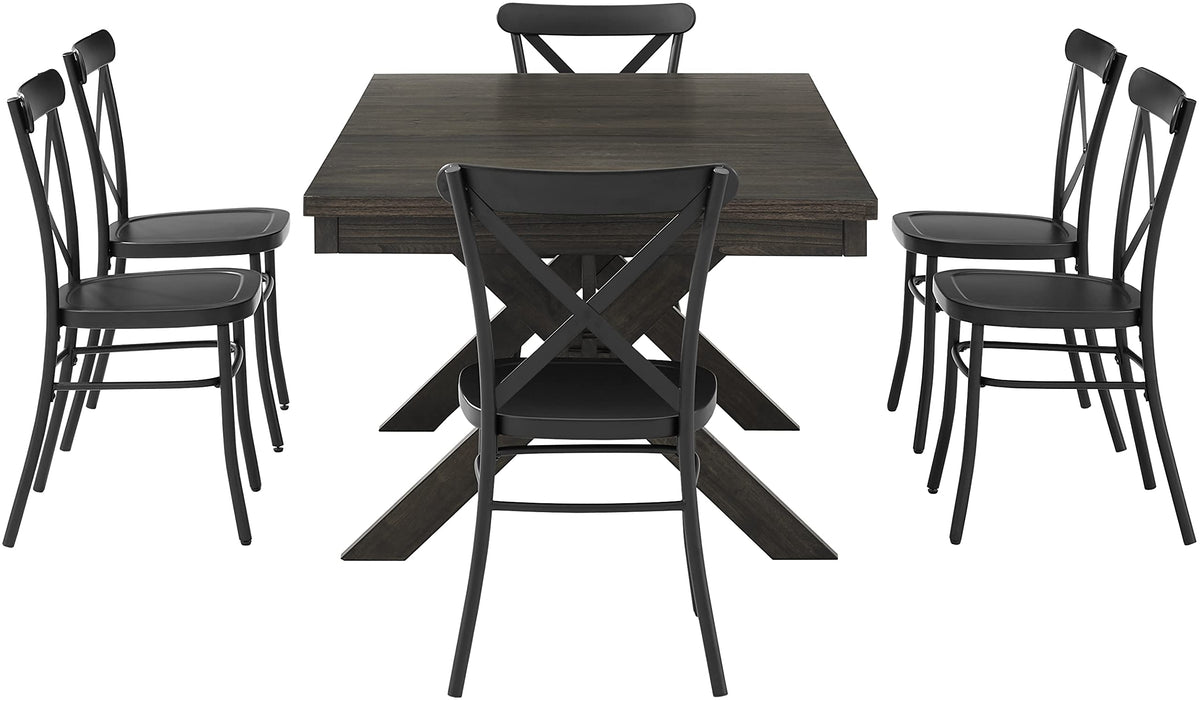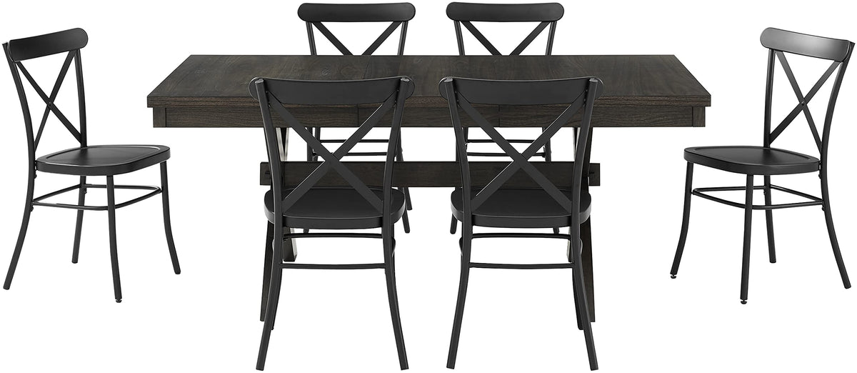 Bring modern farmhouse style to family gatherings with the Hayden Dining Set with Camille Chairs. Blending rustic wood and sturdy steel, this set features an extendable table with an 18” leaf surrounded by six all-metal x-back dining chairs. Beautifully crafted with X-shaped legs, the table's trestle base makes the Hayden 7-Piece Dining Set a timeless centerpiece for your dining room.