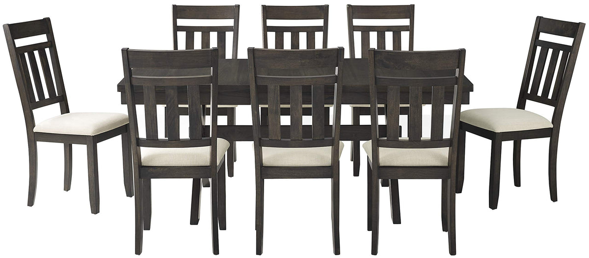 Sure to be the focal point of your modern farmhouse decor, the Hayden 9-Piece Dining Set brings rustic style to family gatherings. Featuring an 18” extension leaf, the table accommodates the eight included dining chairs. The X-shaped legs of the table complement the classic slat back design of the dining chairs, making the Hayden 9-Piece Dining Set a timeless centerpiece for your dining room.