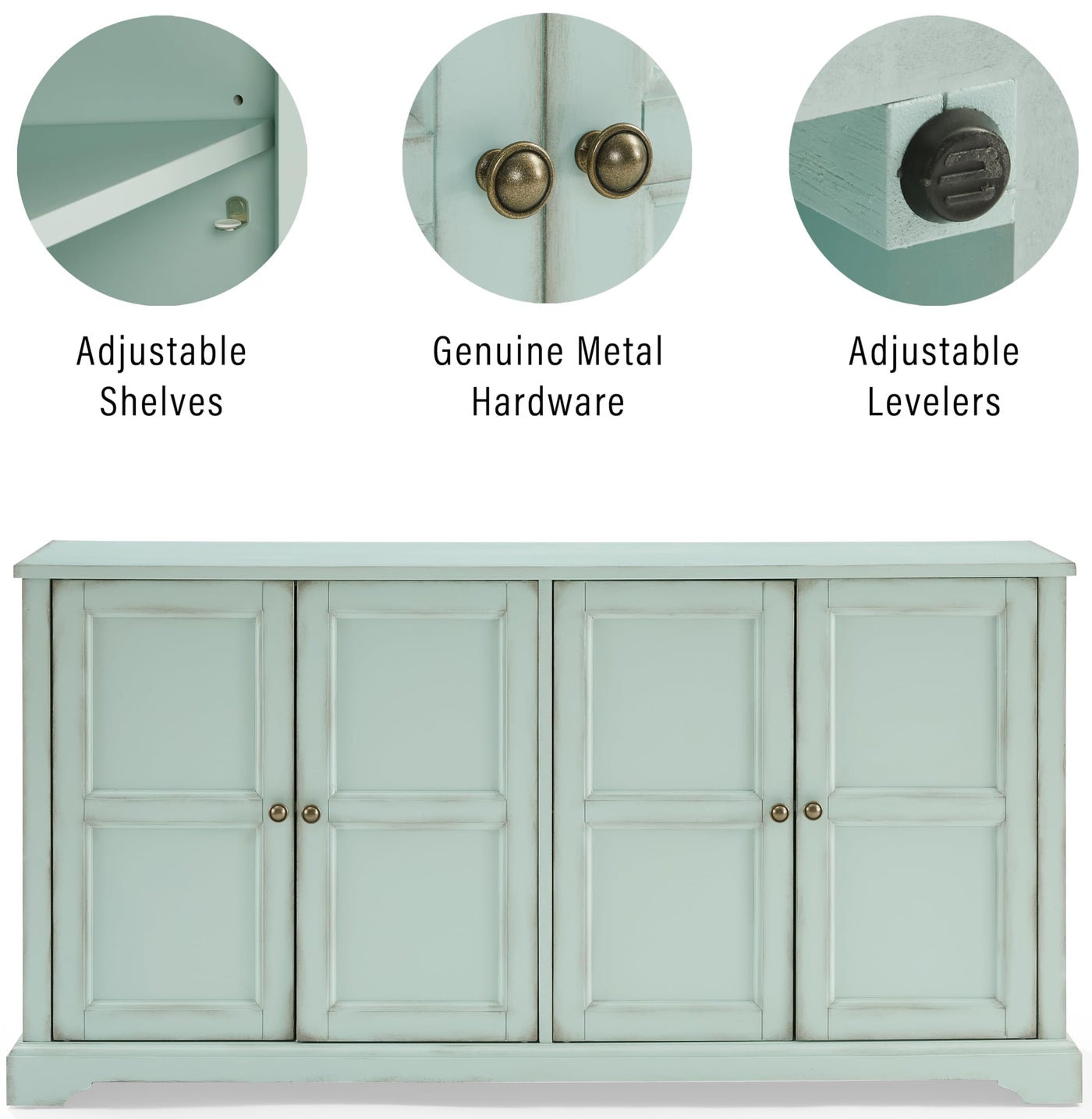 Hand-Rubbed Finish: The distressed seafoam blue finish adds a touch of sophistication, while the genuine metal hardware in an antique gold finish enhances its vintage appeal.