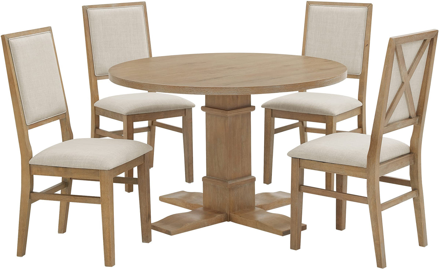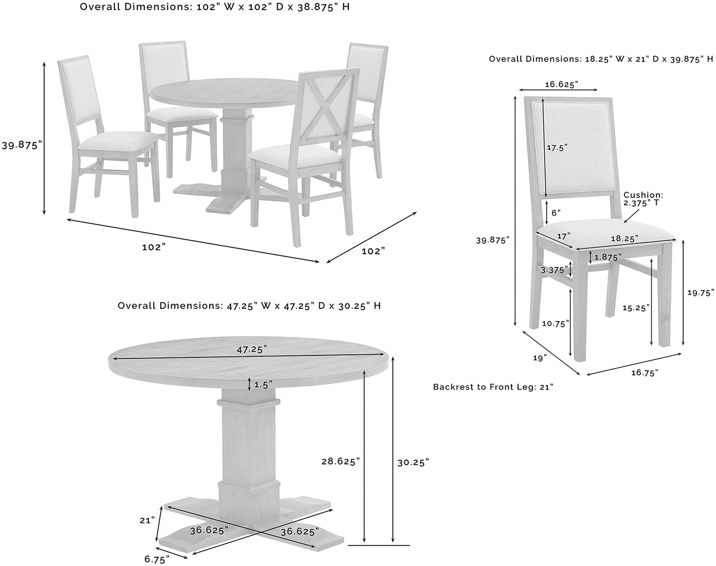 Capture the laid-back elegance of modern farmhouse design with the Crosley Furniture Joanna 5-Piece Round Dining Set. The round pedestal table pairs beautifully with the upholstered dining chairs, offering seating for up to four diners. Each chair features upholstered backs and seats with a classic wooden X design on the back. Balancing the table's substantial pedestal base is a spacious tabletop, making the Joanna 5-Piece Round Dining Set ideal for your nightly family meal. Upholstered Chair Dimensions - 39.88"H x 18.25"W x 21"D. Round Table Dimensions - 30.25"H x 47.25"W x 47.25"D.