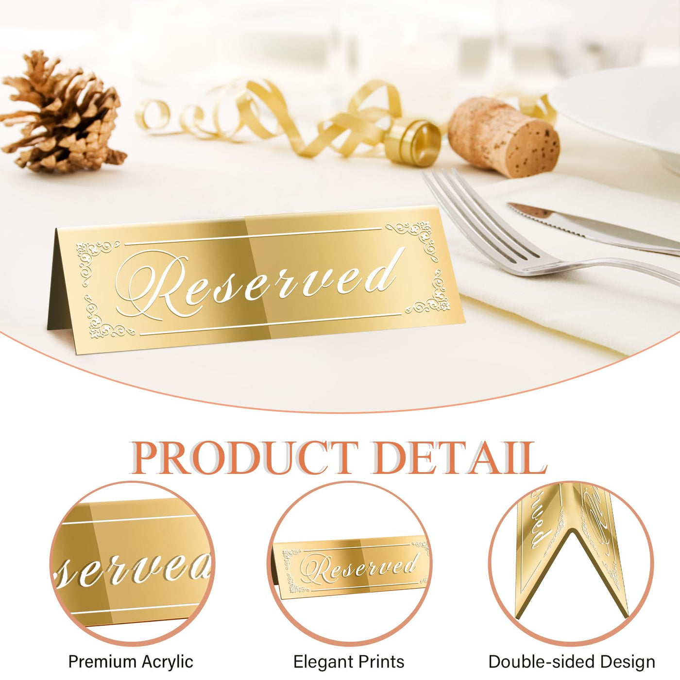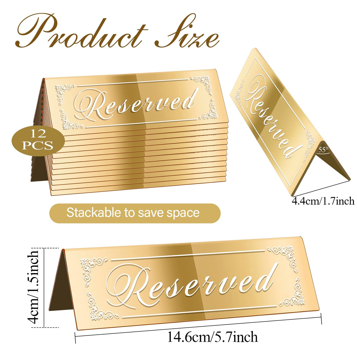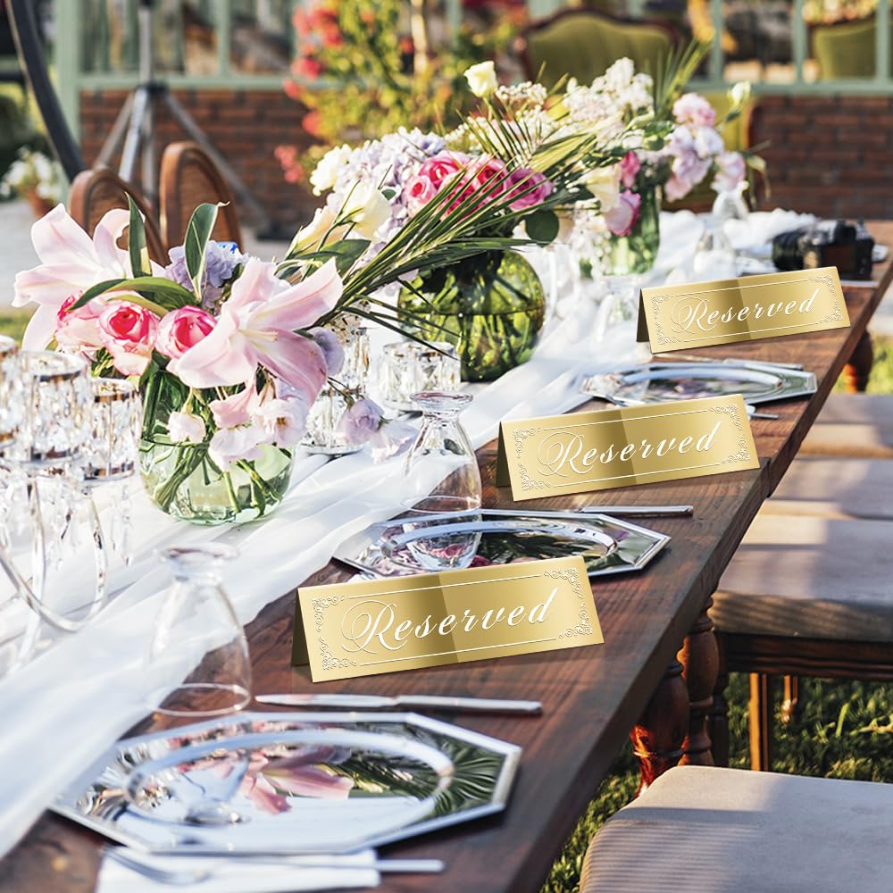 Q: How are these table signs designed for visibility?A: These table signs feature a double-sided mirrored design that allows guests to view them from different angles. This ensures that the reserved seating is easily noticeable, enhancing the overall guest experience at your event.