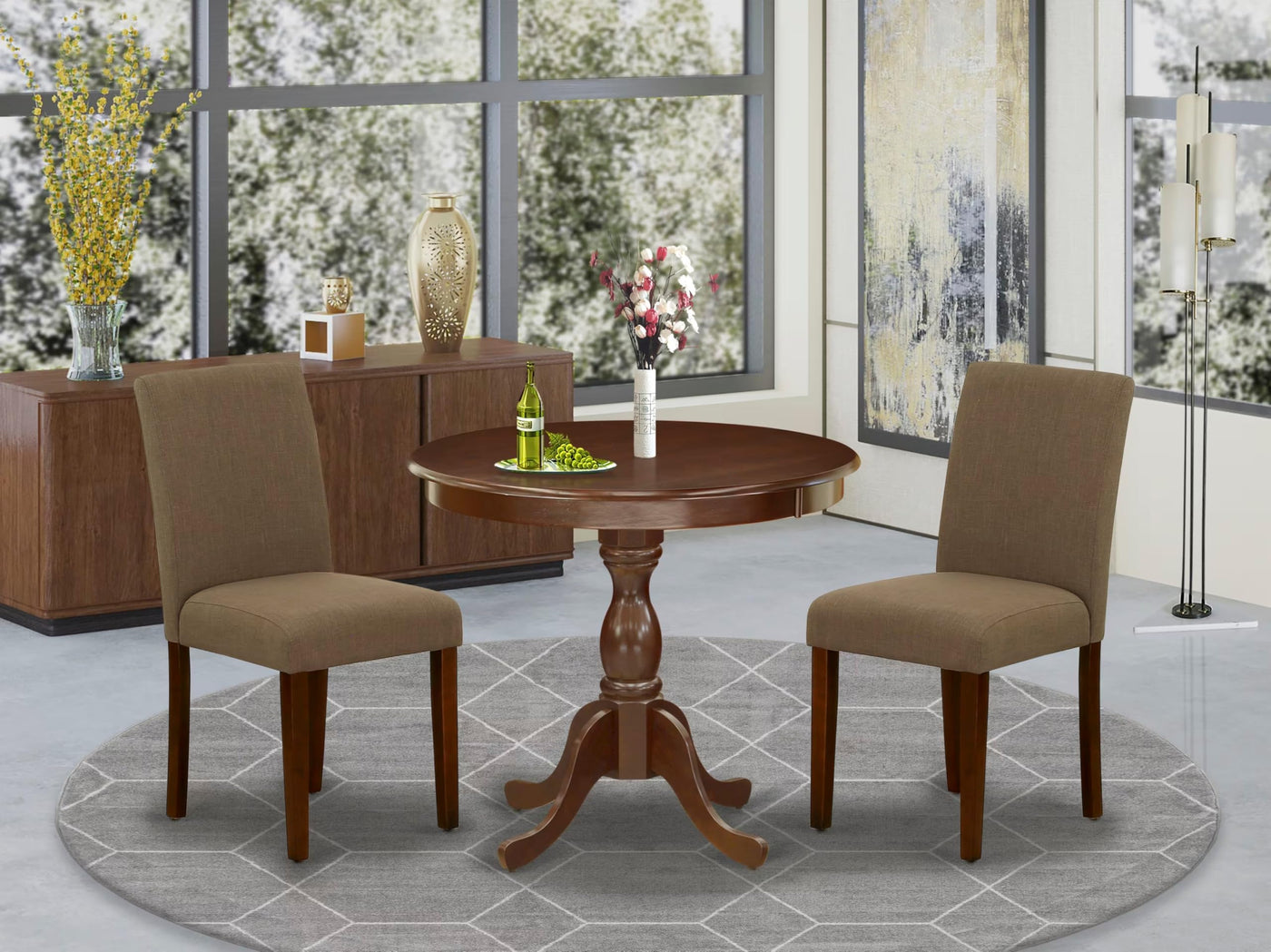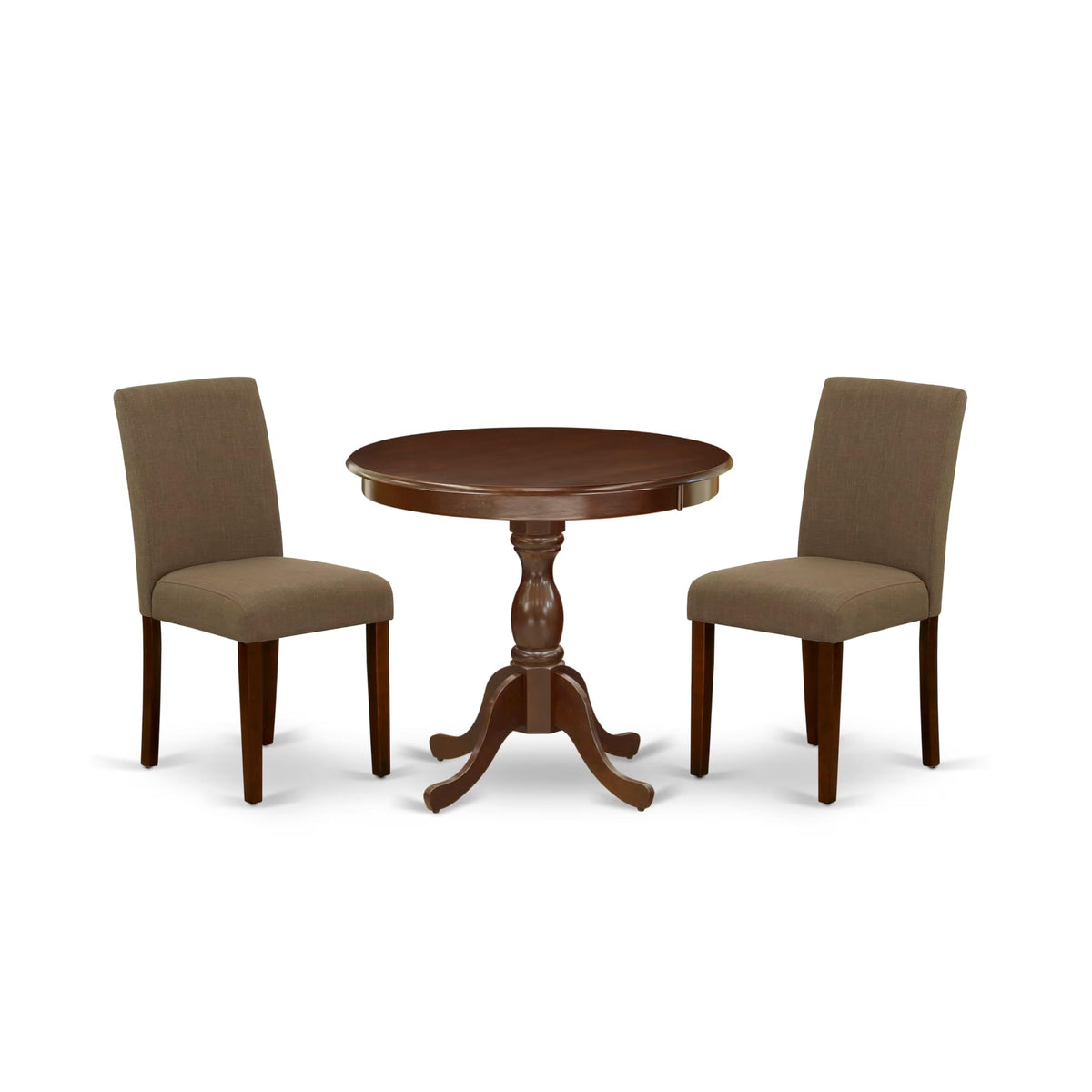 East West Furniture AMAB3-MAH-18 3 Piece Kitchen Table Set for Small Spaces Contains a Round Dining Table with Pedestal and 2 Coffee Linen Fabric Upholstered Chairs, 36x36 Inch, Mahogany