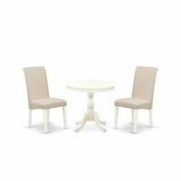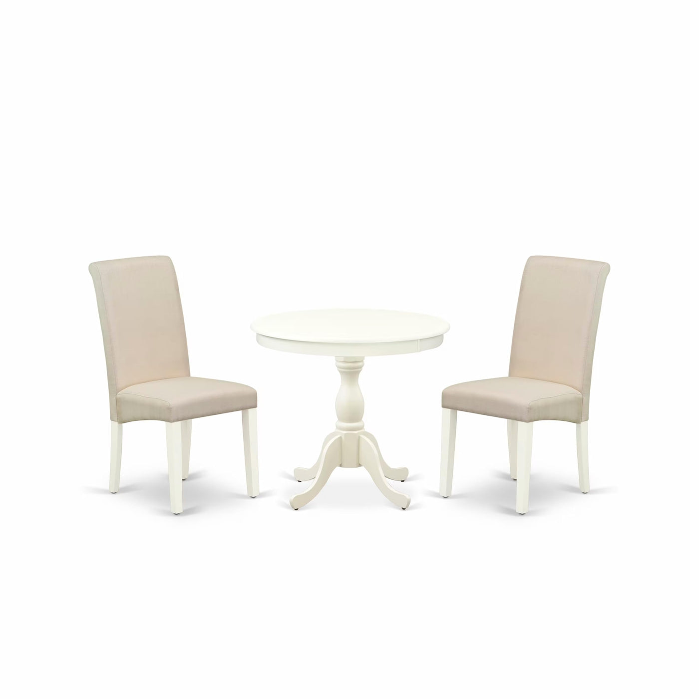 East West Furniture AMBA3-LWH-01 3 Piece Modern Dining Table Set Contains a Round Kitchen Table with Pedestal and 2 Cream Linen Fabric Upholstered Parson Chairs, 36x36 Inch, Linen White