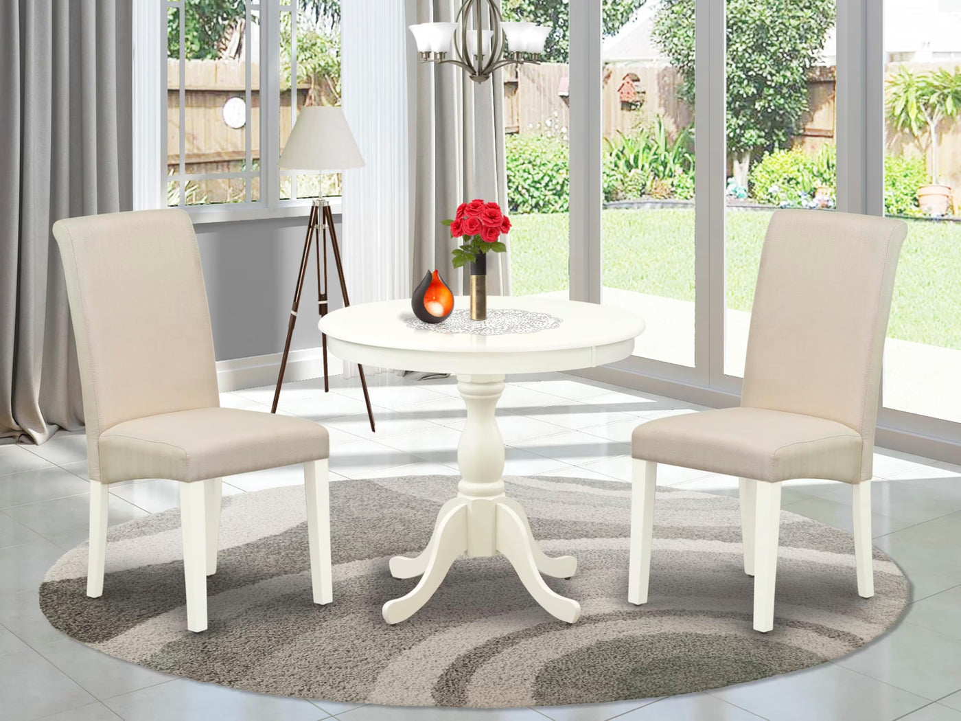 EAST WEST FURNITURE - AMBA3-LWH-01 - 3-PIECE kitchen SETThe Marvelous 3-Piece dining table set is a refined addition to any dining room. This set comprises a modern dining table and 2 matching dining chairs, which boast an innovative and elegant design that effortlessly complements any decor. The Linen white color of the table is perfectly matched with the Cream Linen Fabric parson chairs, making for an aesthetically pleasing set that is sure to impress. The upholstered dining chairs are particularly notable, featuring a contemporary High Chair Back that perfectly complements the Linen Fabric seat, resulting in a sophisticated appearance. The classical style of the pedestal table is further accentuated by its spacious tabletop, made of top-quality Rubber Wood material that guarantees heightened durability and long-lasting use. The chairs are crafted with soft Linen Fabric padded, and comfortable padded cushions, all resting on a solid natural wood frame that ensures both quality and design. Each dining set is accompanied by clear and easy-to-follow instructions, as well as all necessary tools for quick and easy assembly. This contemporary, budget-friendly, durable, and comfortable kitchen set is the perfect choice for those who seek a great dining experience with family and friends. Keep Enjoying East West Furniture!PRODUCT FEATURES: Frame Material: Rubbe Wood Fabric Type: Linen Fabric Linen Fabric Color: Cream Frame Color: Linen White Chair Back Style: High Back Dimension of Table: Length: 36; Width: 36; Height: 29.5. Chair Dimension: Length: 22.5; Width: 18; Height: 38.5.Include in Package: 2 Dining Chairs and 1 Dinner Table.