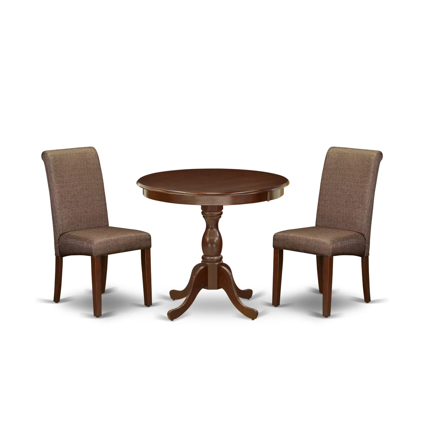 East West Furniture AMBA3-MAH-18 3 Piece Modern Dining Table Set Contains a Round Kitchen Table with Pedestal and 2 Brown Linen Linen Fabric Parson Dining Chairs, 36x36 Inch, Mahogany