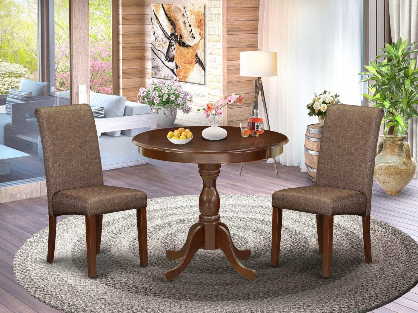 EAST WEST FURNITURE - AMBA3-MAH-18 - 3-PIECE DINING TABLE SETThe Gorgeous 3-piece kitchen set is an exquisite addition to any dining space. It includes a dining table and 2 Linen Fabric kitchen chairs, designed to enhance the ambiance of your home. Our parson dining chairs exude sophistication, featuring an innovative design that blends seamlessly with diverse decor styles. The round pedestal table is a classic masterpiece, designed with a Mahogany color that perfectly matches the Brown Linen Fabric dining chairs, making them even more appealing. The contemporary High Chair Back adds a touch of elegance and complements the Linen Fabric seat, creating a charming appearance. The spacious dining table made from premium quality Rubber Wood material provides heightened durability and long-lasting use. These chairs are crafted with soft Linen Fabric upholstery, and comfortable padded cushions, all set on a sturdy natural wood frame, ensuring superior quality and design. This contemporary and stylish wooden dining table set is an excellent choice for creating a warm and inviting atmosphere for a pleasant dining experience with loved ones. The kitchen table set comes with easy-to-follow instructions and all necessary tools for quick and convenient assembly, making it a practical and budget-friendly choice for any dining room. Keep Enjoying East West Furniture!PRODUCT FEATURES: Frame Material: Rubber wood Fabric Type: Linen Fabric Linen Fabric Color: Brown Frame Color: Mahogany Chair Back Style: High Back Dimension of Table: Length: 36; Width: 36; Height: 29.5. Chair Dimension: Length: 22.5; Width: 18; Height: 38.5.Include: 2 Kitchen Chairs and A Round Pedestal Table.