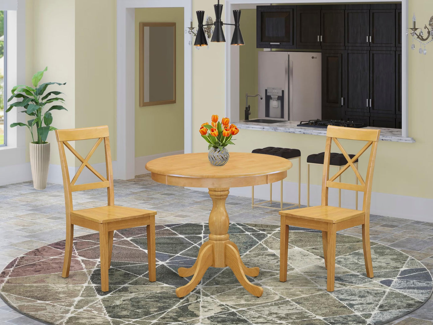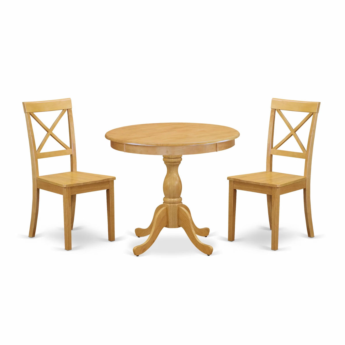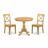 EAST WEST FURNITURE - AMBO3-OAK-W - 3-PC KITCHEN TABLE SETThe 3 Piece kitchen set by Marvelous is comprised of a round table and 2 dining chairs that are designed to match. The wooden table features a classic design and an Oak color that complements the wood dining chairs, enhancing its visual appeal. The contemporary X-Back of the wooden chairs complements the wood seat beautifully, creating an elegant and refined look. The spacious tabletop is crafted from high-quality Rubber Wood material, ensuring heightened sturdiness and long-lasting use. The set is engineered for easy and rapid assembly, with detailed instructions and all necessary tools included. The dining table set is effortless to clean with a damp cloth and furniture cleaner, thanks to its smooth brush finish. Savor your meals in style and comfort with the chic and functional East West Furniture set.PRODUCT FEATURES: Frame Material : Asian wood Seat Material: Wooden Chair Color: Oak Color: Oak Chair Back Style: X-Back Dimension of Table: Length: 36; Width: 36; Height: 29.5. Chair Dimension: Length: 21; Width: 18; Height: 38.Include: 2 Dining Chair and 1 Round Dining Table.
