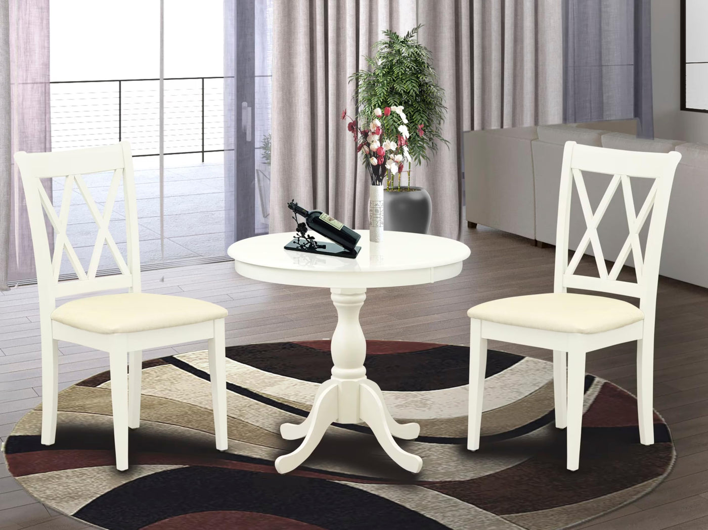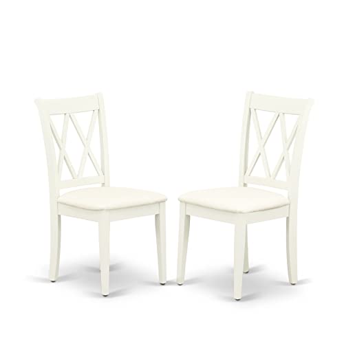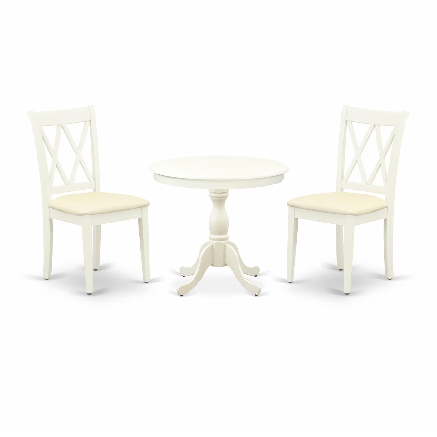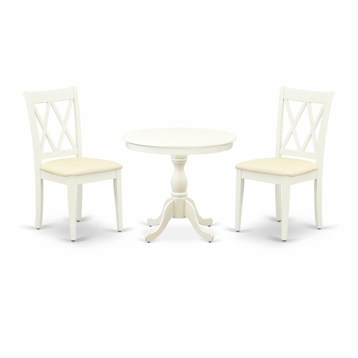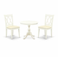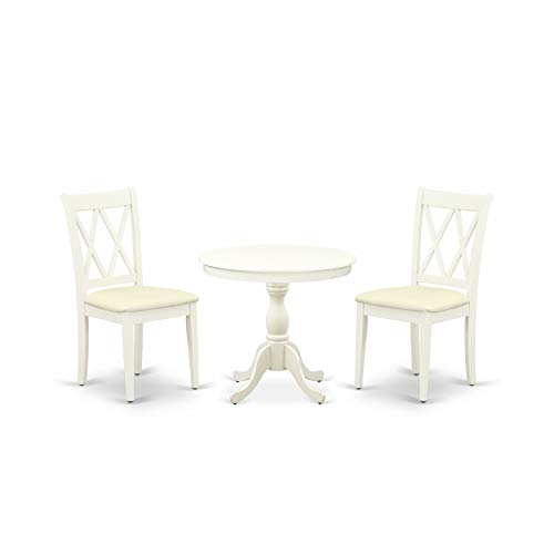 EAST WEST FURNITURE - AMCL3-LWH-C - 3-PC MODERN DINING TABLE SETThe sophisticated 3-piece dining set comprises a round table and 2 wooden kitchen chairs that exude elegance and refinement. The wooden table, designed in a classical style, is finished in a Linen white color that complements the wooden chairs, resulting in an attractive appearance. The Dining Chair boasts a soft Linen Fabric Seat with a contemporary Double X-Back that perfectly complements it. The spacious tabletop is crafted from high-quality Rubber Wood material, ensuring heightened sturdiness and long-lasting use. The East West Furniture dining set's smooth brush finish makes it easy to clean with a damp cloth and furniture cleanser, ensuring it stays in pristine condition. Overall, this dining set is a testament to quality craftsmanship and a stylish addition to any room.PRODUCT FEATURES: Frame Material: Asian Wood Seat Material: Linen Fabric Color: Linen White Chair Back Style: Double X-Back Dimension of Table: Length: 36; Width: 36; Height: 29.5. Chair Dimension: Length: 22; Width: 18; Height: 37.Include: 2 Wooden Kitchen Chairs and A Wood Table.