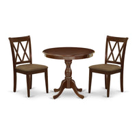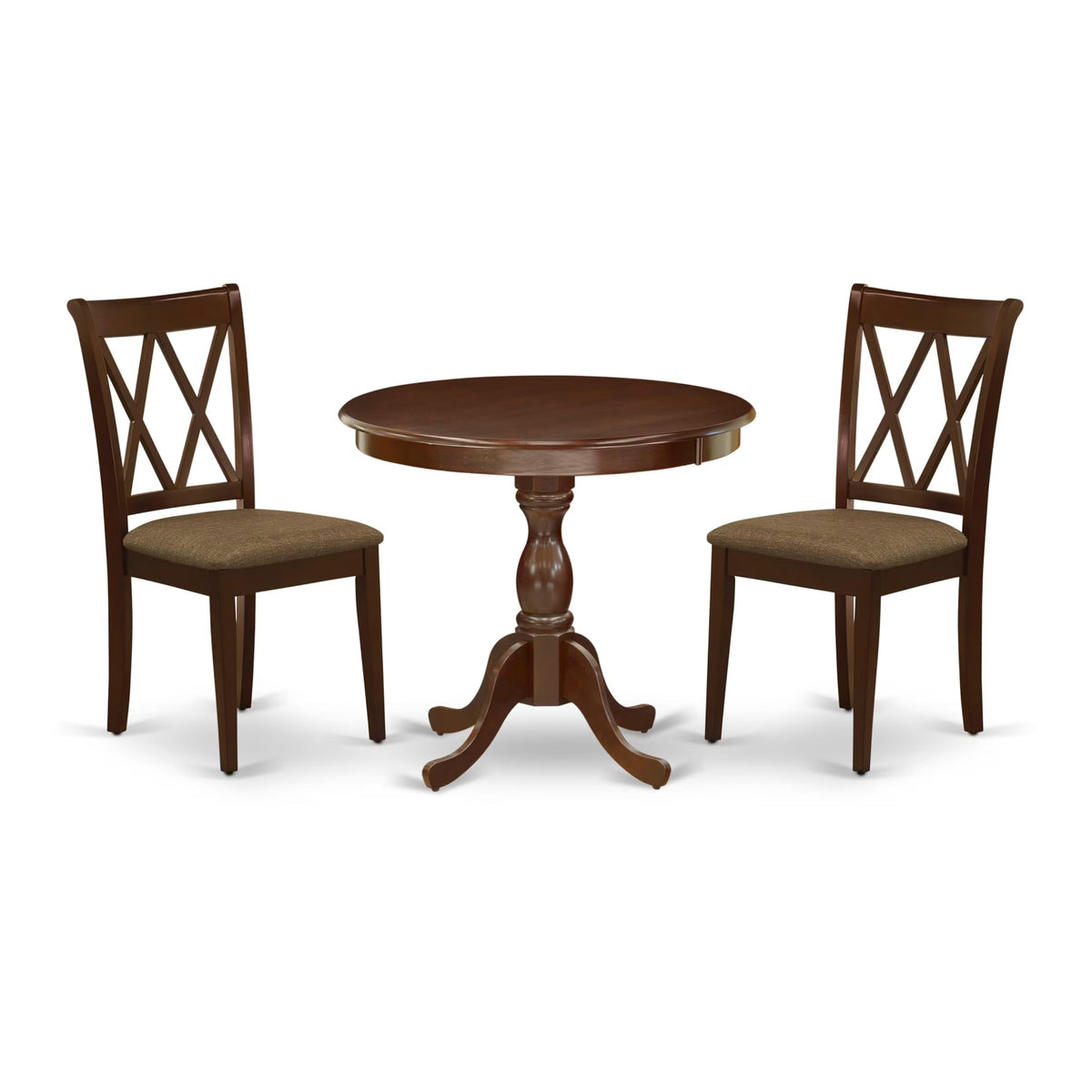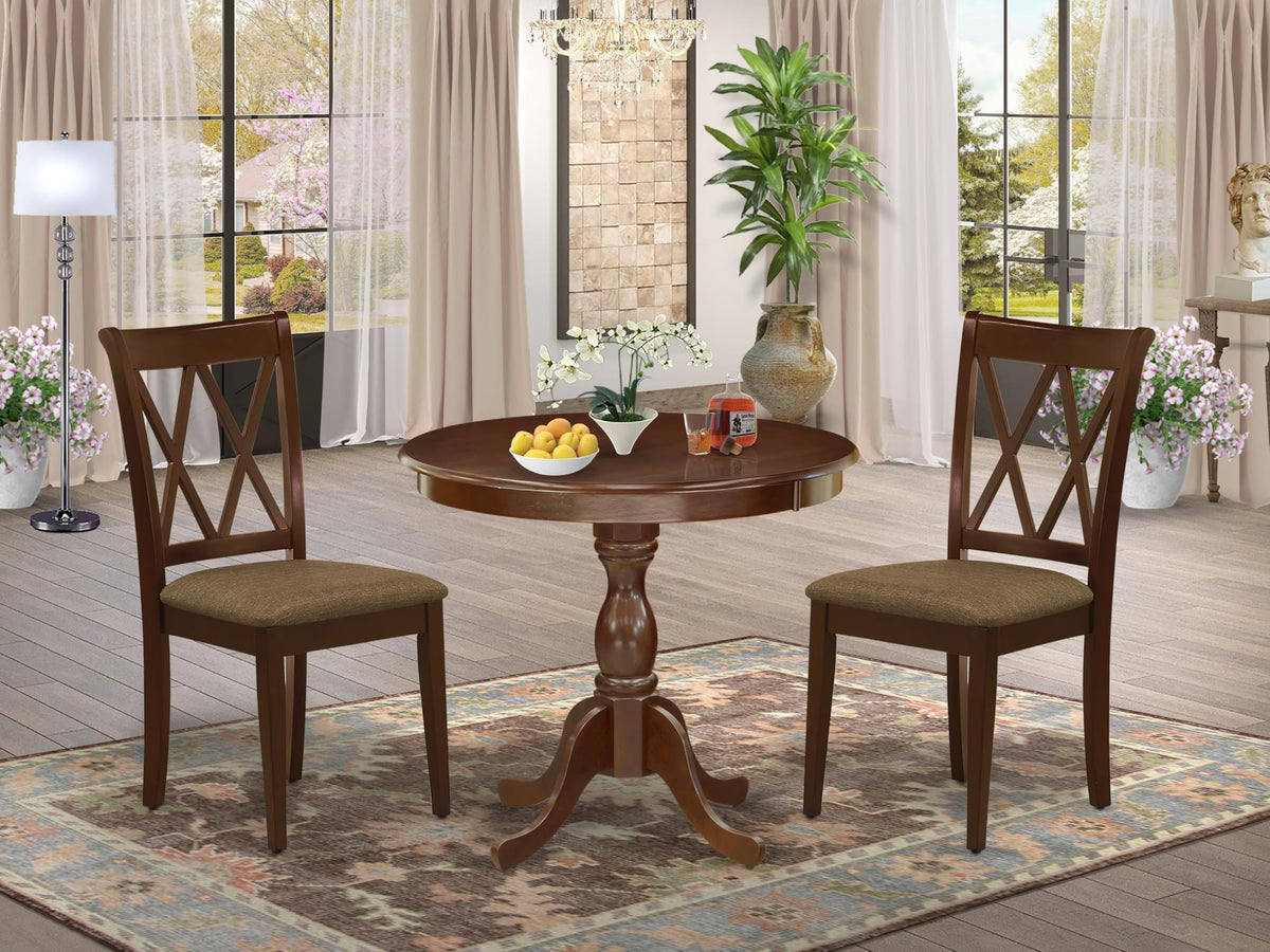 East West Furniture AMCL3-MAH-C 3 Piece Dining Room Furniture Set Contains a Round Dining Table with Pedestal and 2 Linen Fabric Upholstered Chairs, 36x36 Inch, Mahogany