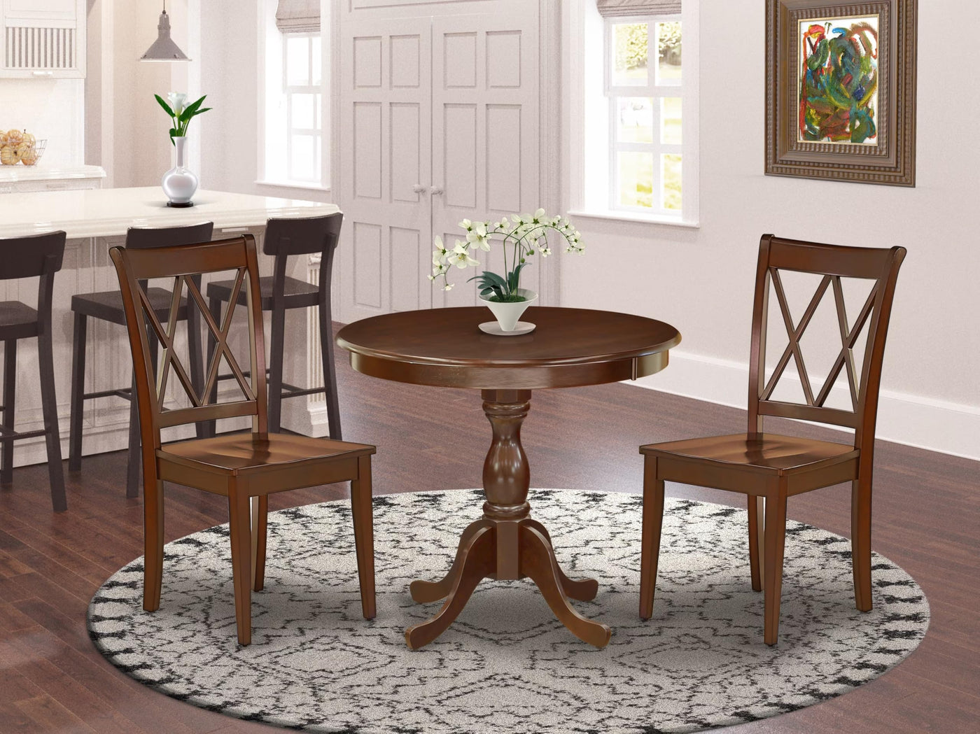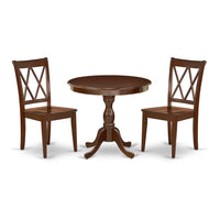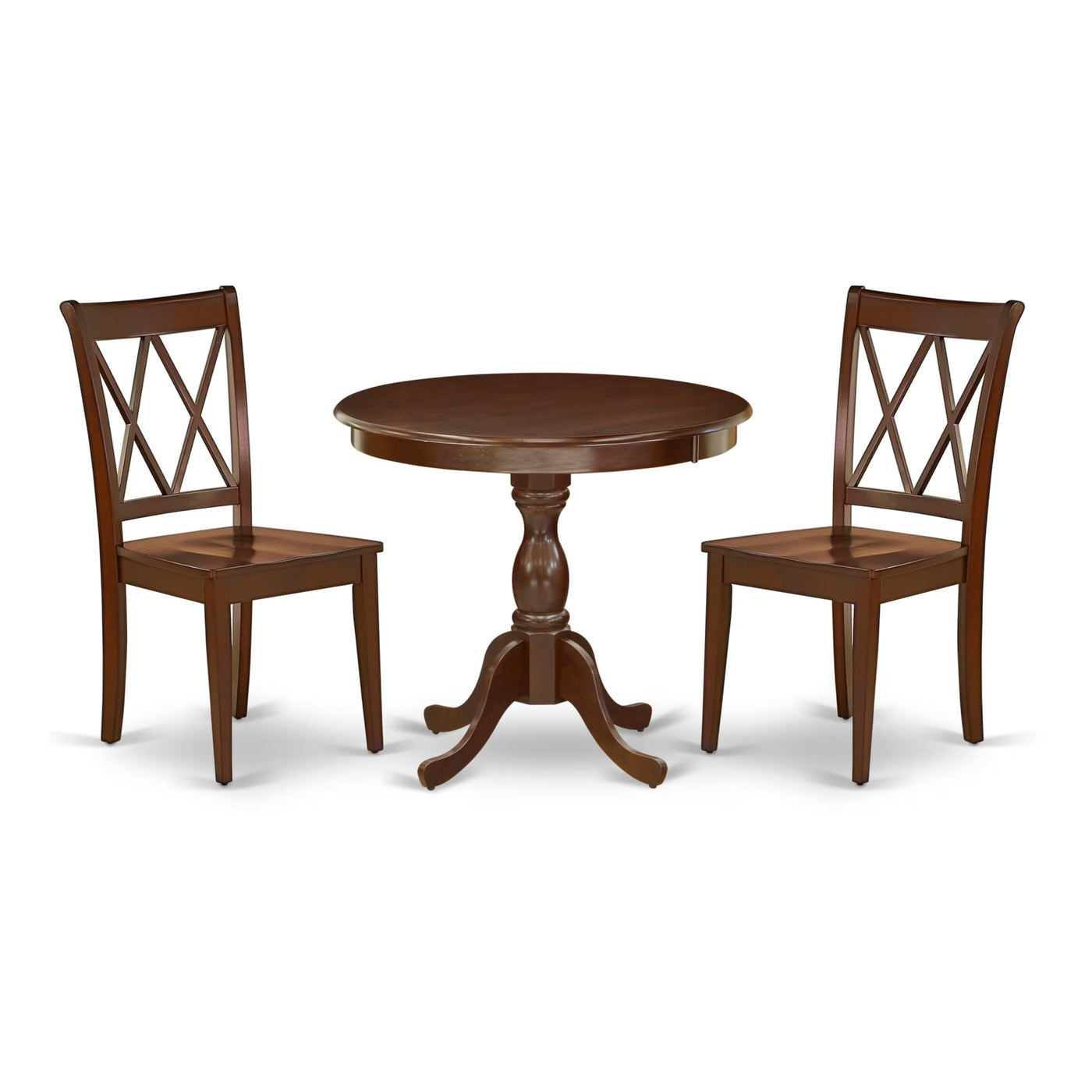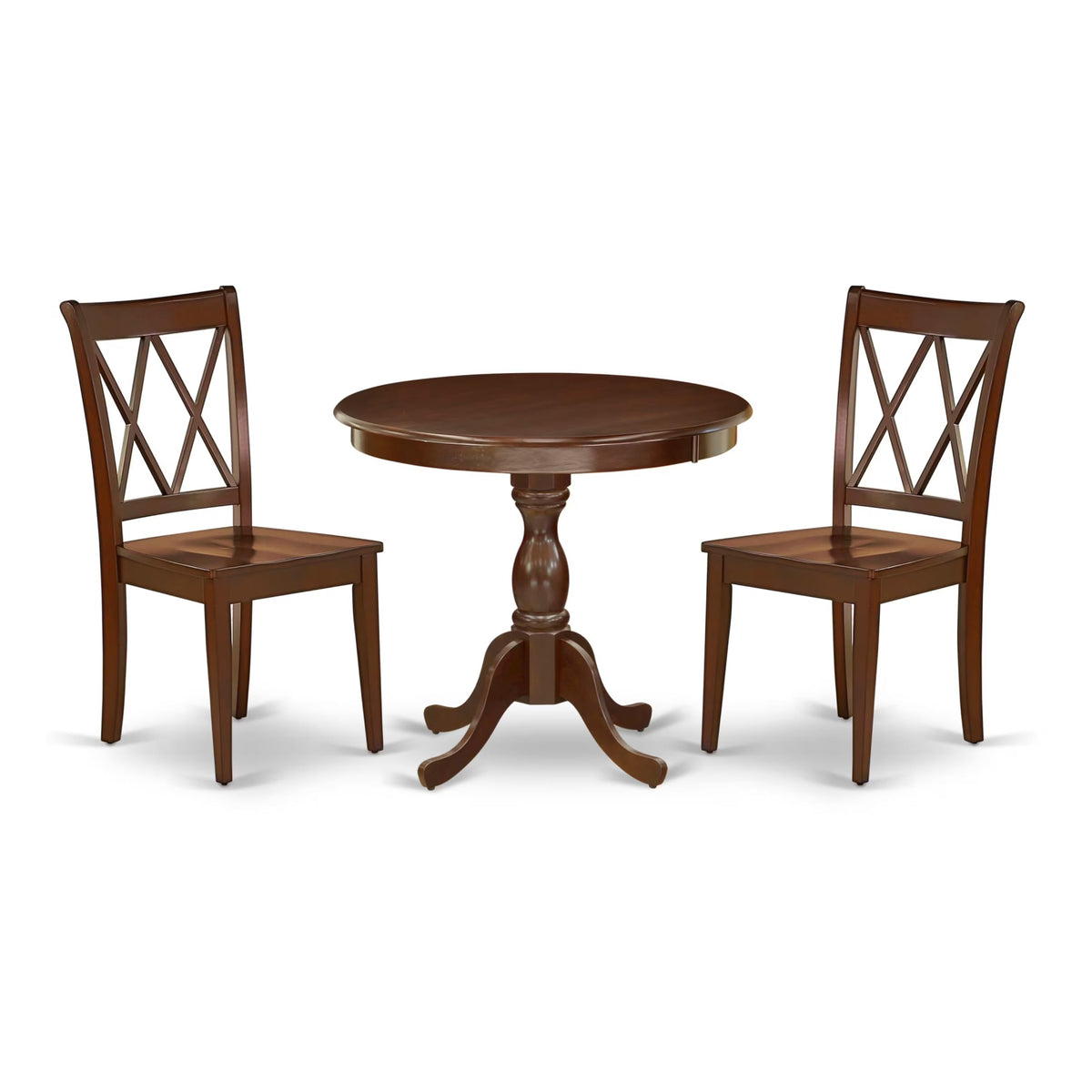 EAST WEST FURNITURE - AMCL3-MAH-W - 3-PIECE WOODEN DINING TABLE SETThe 3-piece kitchen table set exudes elegance and comprises a circular dining table and 2 matching wood dining chairs. The wooden table boasts a classic design and is finished in Mahogany, which enhances its allure and matches the dining chairs perfectly. The contemporary Double X-Back design of the dining chair seamlessly blends with the solid wood seat, creating a refined aesthetic. The spacious tabletop is crafted from high-quality Rubber Wood material, providing enhanced sturdiness and longevity. The smooth brush finish allows for easy maintenance by cleaning with a damp cloth and furniture cleaner. Additionally, the kitchen table set is easy to maintain and clean, thanks to its smooth brush finish, which can be effortlessly wiped with a damp cloth and furniture cleaner. Experience the epitome of style and functionality with the East-West Furniture dining set.PRODUCT FEATURES: Frame Material : Asian Wood Seat Material: Wooden Color: Mahogany Chair Back Style: Double X-Back Dimension of Table: Length: 36; Width: 36; Height: 29.5. Chair Dimension: Length: 22; Width: 18; Height: 37.Include in Package: 2 Wood Dining Chairs and 1 Modern Dining Table.