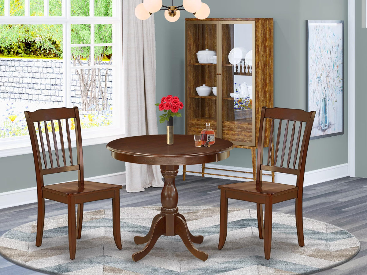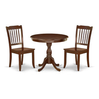 EAST WEST FURNITURE - AMDA3-MAH-W - 3-PC DINING TABLE SETThe 3-piece dining room table set is a testament to sophistication and comprises a mid century modern dining table and 2 matching chairs. The round dining table is crafted in a classical style and boasts a rich mahogany color that perfectly matches the kitchen chairs, adding to its overall allure. The chairs are designed to elevate the aesthetic of any room with their elegant design that seamlessly complements a variety of decor styles. The wooden chairs feature a contemporary slatted back that blends seamlessly with the wood seat, creating a refined and sophisticated appeal. The top-quality Rubber Wood material used to construct the spacious tabletop ensures heightened toughness and durability for long-lasting use. This table set has been thoughtfully designed with ease and efficiency of assembly in mind, and it comes with clear and concise instructions and all necessary tools included. The smooth brush finish of the set allows for easy maintenance with a simple wipe down using a damp cloth and furniture cleaner. Enjoy the timeless sophistication and durability of the 3-piece dining room table set by East West Furniture.PRODUCT FEATURES: Frame Material: Rubber Wood Chair Seat Material: Wooden Frame Color: Mahogany Chair Back Style: Slatted Back Dimension of Table: Length: 36; Width: 36; Height: 29.5. Chair Dimension: Length: 22; Width: 18; Height: 38.Include: 2 Wood Dining Chairs and A Dining Table.