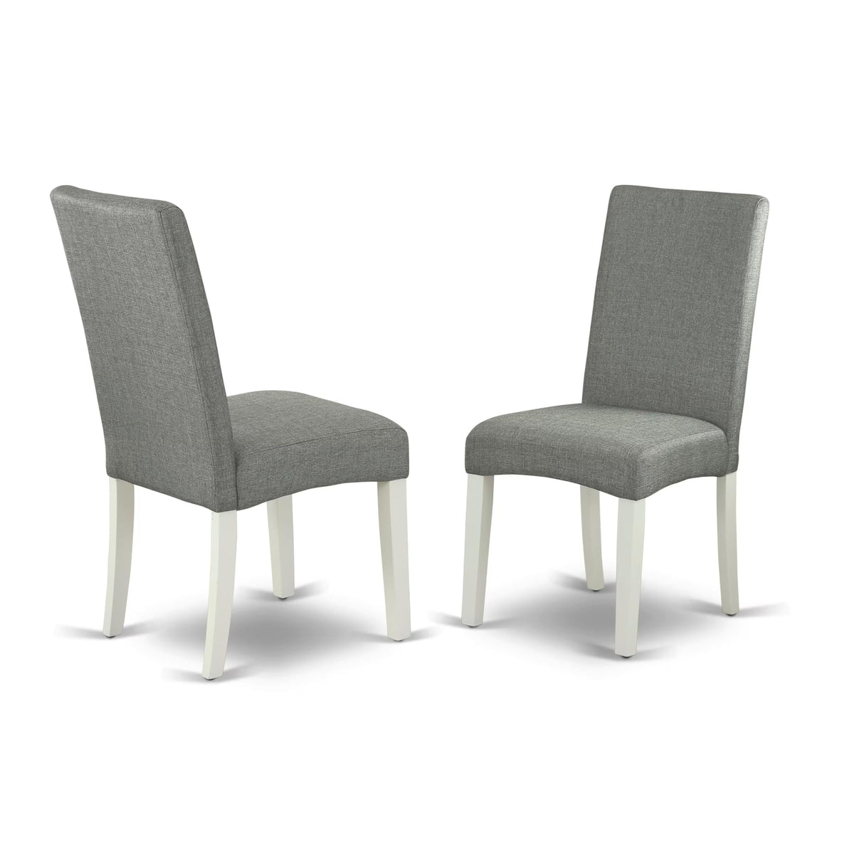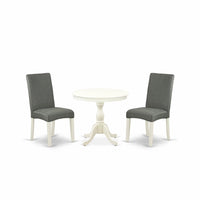 EAST WEST FURNITURE - AMDR3-LWH-07 - 3-PIECE DINING SETThe 3-piece kitchen table set is a sophisticated and elegant addition to any dining space. It includes a wooden table and 2 matching parson dining chairs that seamlessly blend with any decor, adding a touch of modernity to the room. The classic style of the wood dining table, coupled with the Linen White table color that matches the Grey Linen Fabric chairs, enhances the set's overall attractive appearance. The contemporary high chair back design of the upholstered chairs is complemented by the linen fabric seat, creating a refined appearance that exudes both quality and design. The soft linen fabric upholstery and comfortable padded cushion guarantee optimal comfort during dining. The solid natural wood frame of the chairs ensures durability and longevity. The spacious tabletop is made of superior-quality rubber wood material, which ensures heightened durability and long-lasting use. The set is designed with convenience in mind, with easy and fast assembly facilitated by the provision of instructions and necessary tools. This budget-friendly, durable, and comfortable dining room set is perfect for creating a great dining experience with family and friends. It is an excellent choice for anyone looking to add a touch of sophistication to their dining space while maintaining quality and design. Keep Enjoying East West Furniture!PRODUCT FEATURES: Frame Material: Rubber Wood Fabric Type: Linen Fabric Linen Fabric Color: Grey Frame Color: Linen White Chair Back Style: High Back Dimension of Table: Length: 36; Width: 36; Height: 29.5. Chair Dimension: Length: 24.2; Width: 19.2; Height: 39.Include: 2 Dining Chair and A Round Dining Table.