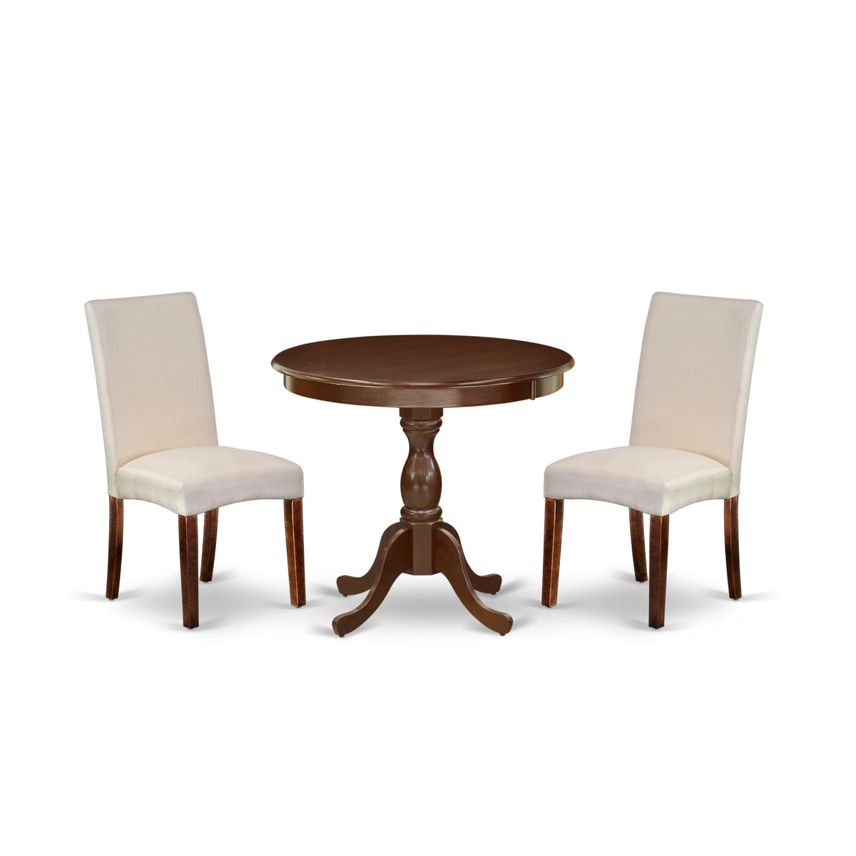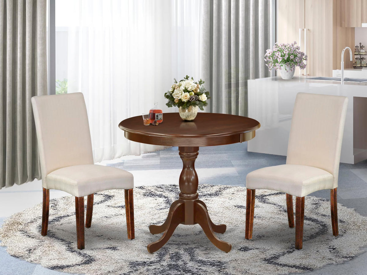 East West Furniture AMDR3-MAH-01 3 Piece Dinette Set for Small Spaces Contains a Round Kitchen Table with Pedestal and 2 Cream Linen Fabric Parson Dining Chairs, 36x36 Inch, Mahogany
