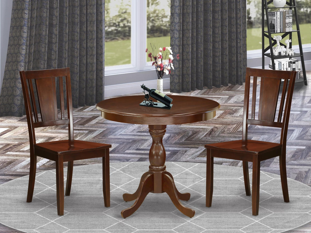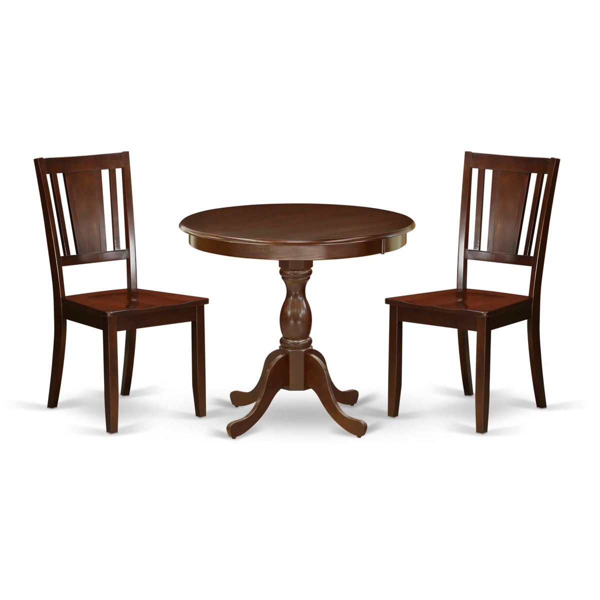 EAST WEST FURNITURE - AMDU3-MAH-W - 3-PIECE WOODEN DINING TABLE SETThe Gorgeous 3 Piece dinette set is consists of 1 pedestal dining table and 2 matching dining room chairs. Our dining chair adds a sense of sophistication to your room and the innovative design is compatible seamlessly with any décor. The contemporary Panel Back of this dining chair blends beautifully with the wood seat, creating a sophisticated appearance. Our dining table is designed in classical style. In addition, the Mahogany color matches modern dining chairs making its appeal more attractive. The Spacious tabletop made of top quality Rubber Wood material help for heightened durability and long-lasting use. Designed with easy and fast assembly in mind, each set comes conveniently packed with easy to follow instructions and all necessary tools included. Our mid century dining set is simple to clean with a damp cloth and furniture cleanser because their brush finish is smooth. Enjoy with East West Furniture!DINING ROOM SET FEATURES: Seat Material: Wooden Chair Color: Mahogany Round Pedestal Table Top Color: Mahogany Dining Room Table Legs Color: Mahogany Dining Chairs Legs Color: Mahogany Chair Back Style: Panel Back Dimension of Table: Length: 36; Width: 36; Height: 29.5 Chair Dimension: Length: 21; Width: 17; Height: 38.Include in this Dining Room Table Set - 2 Dinning Chairs and 1 Modern Kitchen Table.