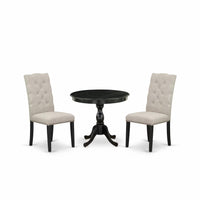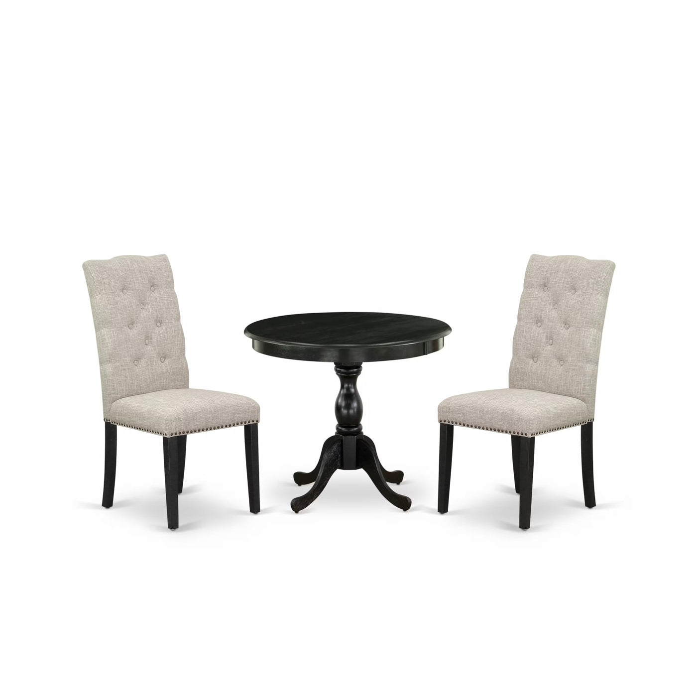 East West Furniture AMEL3-ABK-35 3 Piece Kitchen Table & Chairs Set Contains a Round Dining Room Table with Pedestal and 2 Doeskin Linen Fabric Upholstered Chairs, 36x36 Inch, Wirebrushed Black