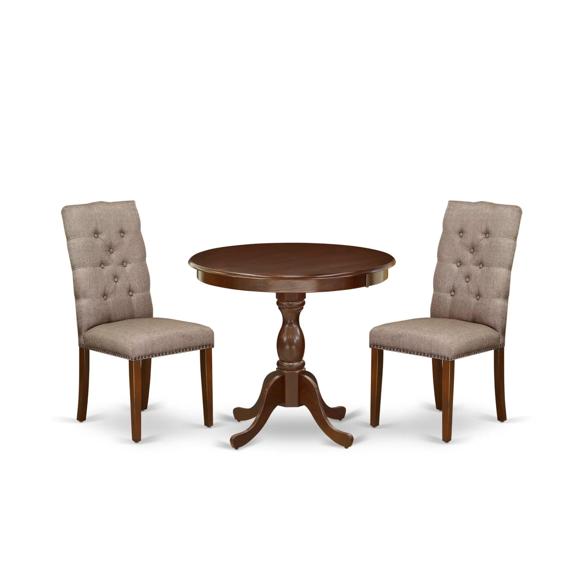 East West Furniture AMEL3-MAH-16 3 Piece Modern Dining Table Set Contains a Round Kitchen Table with Pedestal and 2 Dark Khaki Linen Fabric Upholstered Chairs, 36x36 Inch, Mahogany