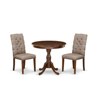 EAST WEST FURNITURE - AMEL3-MAH-16 - 3-PC DINING TABLE SETThe Elegant 3 Piece dining table set consists of 1 pedestal dining table and 2 matching dining chairs. Our parson dining chairs add an air of elegance to your room and their innovative style is compatible seamlessly with any decor. The contemporary Button Tufted Chair Back of this dining room chair blends beautifully with the Linen Fabric seat, creating a sophisticated appearance. The chairs boast soft Linen Fabric upholstery, fine nailhead trim with spring support, comfortable padded cushion, and solid natural wood frame, which are all overflowing in both quality and design. The round pedestal table is designed in a classical style and its Mahogany color matches the Linen Fabric upholstered dining chairs, creating an attractive appearance. The Spacious tabletop made of top quality Rubber Wood material ensures heightened durability and long-lasting use. Designed with easy and fast assembly in mind, each set comes conveniently packed with easy-to-follow instructions and all necessary tools included. This contemporary, budget-friendly, durable and comfortable dining table set furniture can be an excellent choice if you're looking for a great dining experience with family and friends.PRODUCT FEATURES: Fabric Type: Linen Fabric Linen Fabric Color: Dark Khaki Color: Mahogany Chair Back Style: Button Tufted Dimension of Table: Length: 36; Width: 36; Height: 29.5. Chair Dimension: Length: 24.5; Width: 19; Height: 40.5.Include: 2 Parson Dining Chairs and A Modern Dining Table.