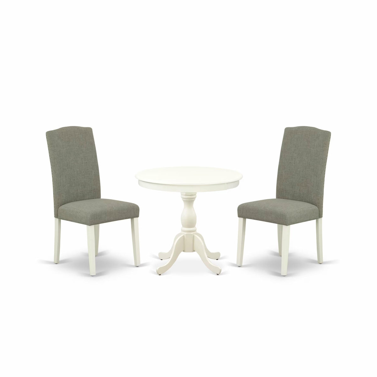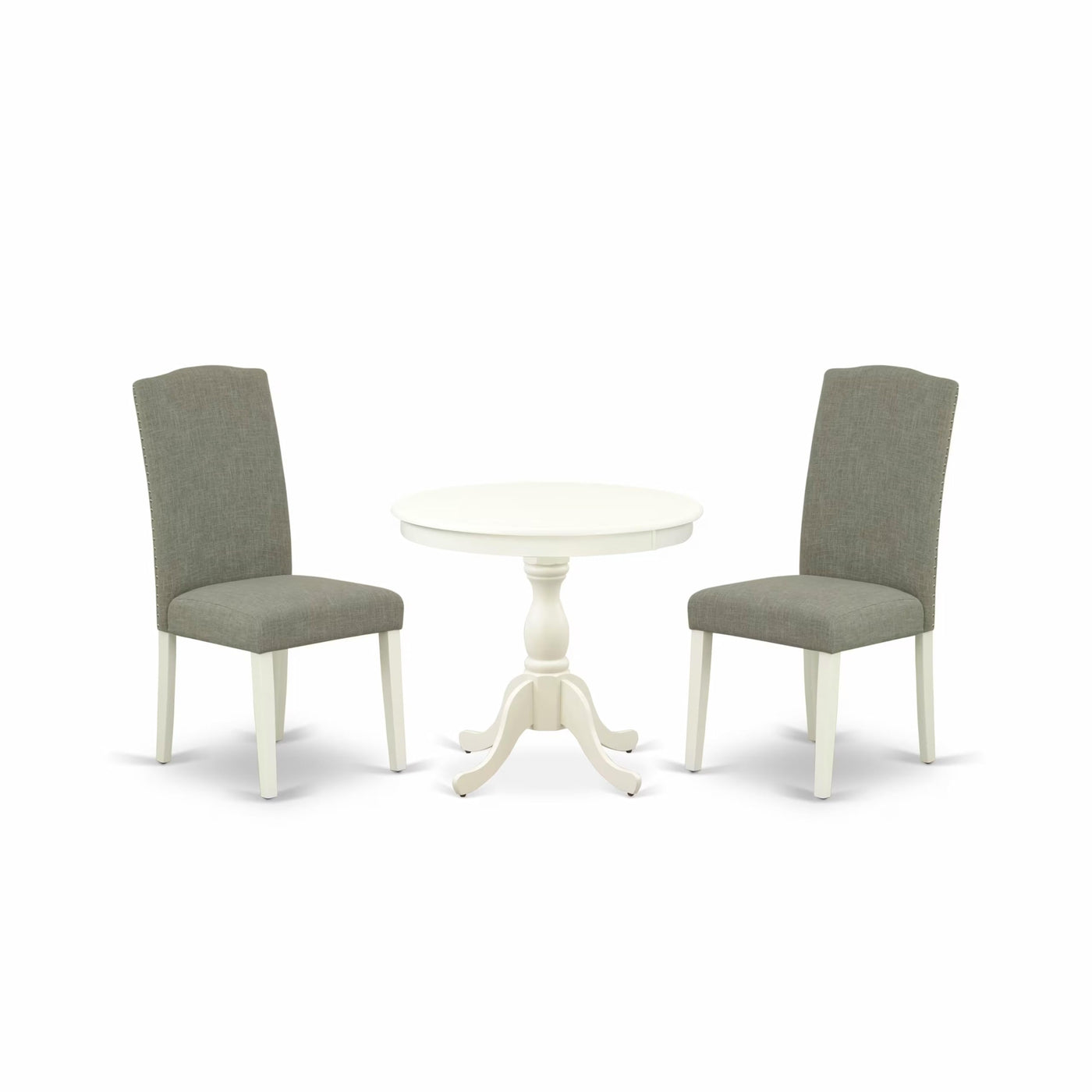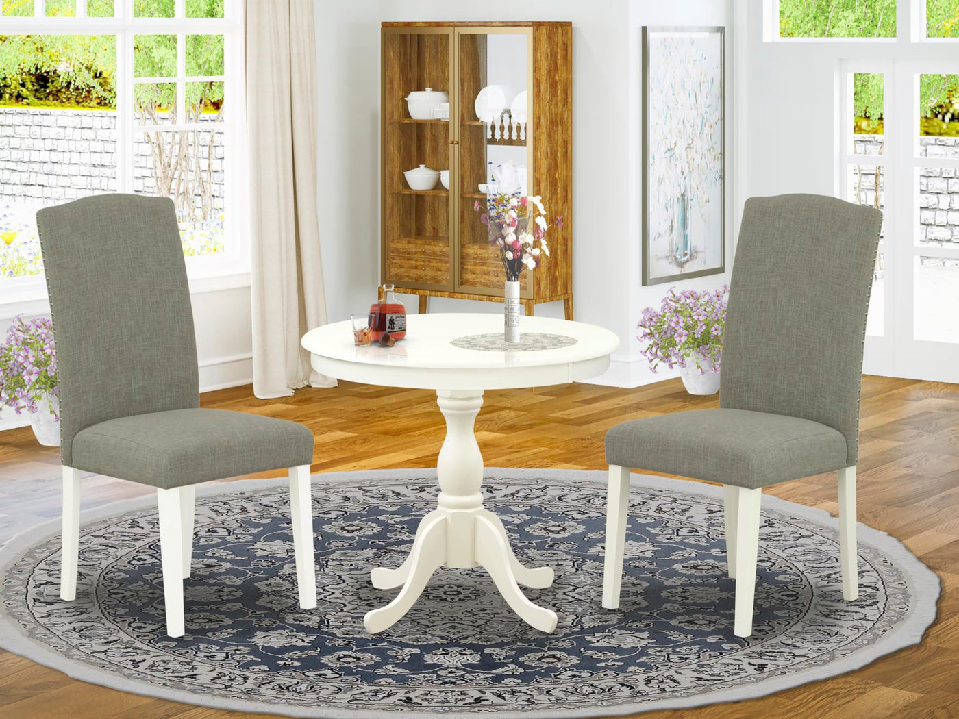 East West Furniture AMEN3-LWH-06 3 Piece Dining Set Contains a Round Kitchen Table with Pedestal and 2 Dark Shitake Linen Fabric Parsons Dining Chairs, 36x36 Inch, Linen White