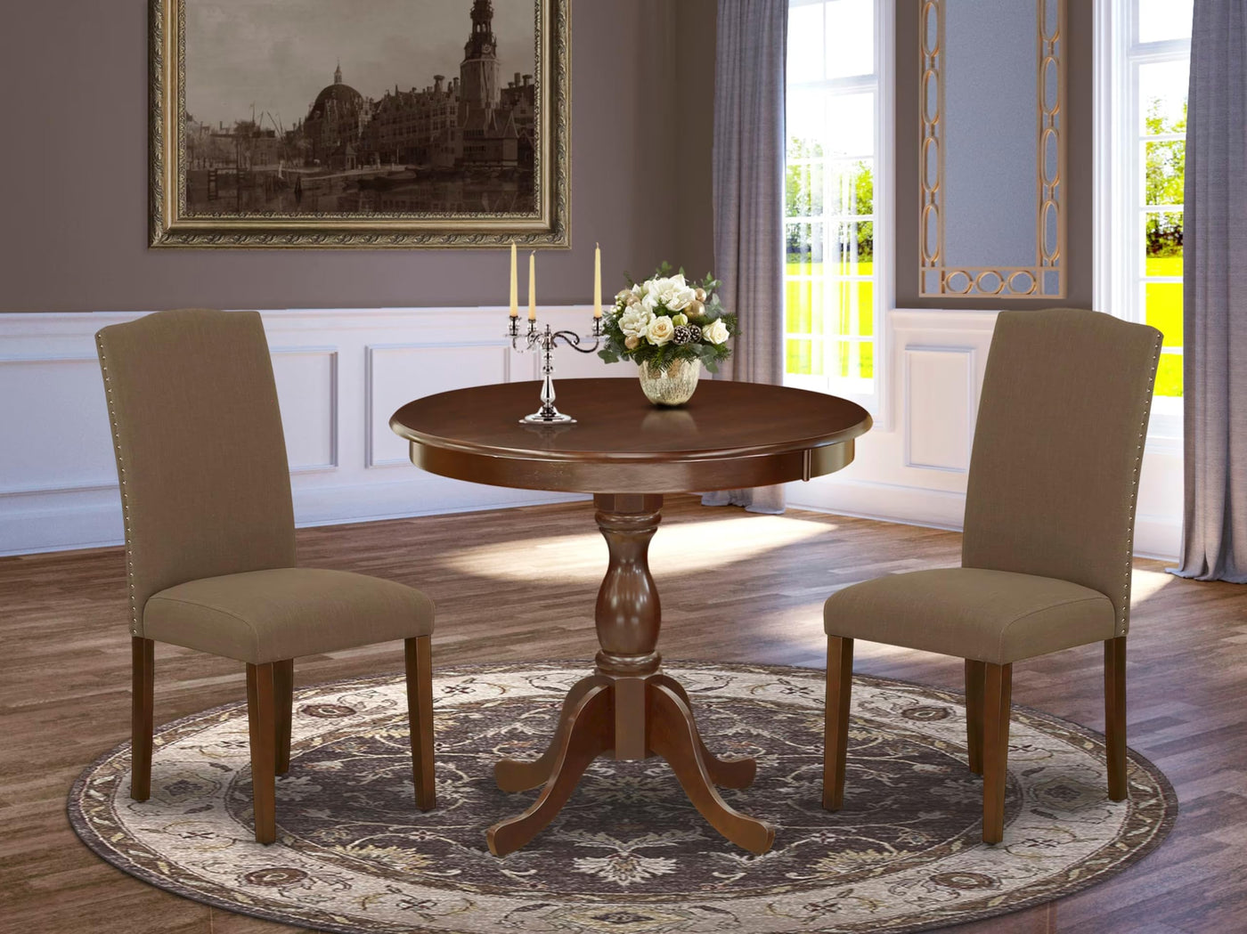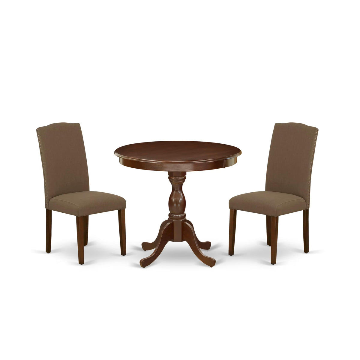 EAST WEST FURNITURE - AMEN3-MAH-18 - 3-PC DINING ROOM SETThis marvelous 3-piece dining set features a kitchen table and 2 matching parson dining room chairs. The upholstered dining chairs add a touch of elegance to your room, and their innovative design blends seamlessly with any decor. The contemporary high chair back beautifully complements the linen fabric seat, creating a sophisticated appearance. Crafted from soft linen fabric upholstery with spring support, a comfortable padded cushion, and a solid natural wood frame, these chairs boast both quality and design. The wood table is designed in a classical style, with the mahogany color perfectly matching the mid-century dining chairs to create a more attractive appearance. The spacious tabletop is made of high-quality rubber wood material, providing heightened durability and long-lasting use. Designed for easy and fast assembly, each set comes conveniently packed with easy-to-follow instructions and all necessary tools included. This contemporary, budget-friendly, durable, and comfortable dining set furniture is an excellent choice for a great dining time experience with family and friends.PRODUCT FEATURES: Fabric Type: Linen Fabric Linen Fabric Color: Coffee Color: Mahogany Chair Back Style: High Back Dimension of Table: Length: 36; Width: 36; Height: 29.5. Chair Dimension: Length: 24.5; Width: 19; Height: 40.5.Include in Package: 2 Dining Chairs and A Dining Table.