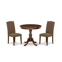 East West Furniture AMEN3-MAH-18 3 Piece Modern Dining Table Set Contains a Round Kitchen Table with Pedestal and 2 Dark Coffee Linen Fabric Upholstered Chairs, 36x36 Inch, Mahogany