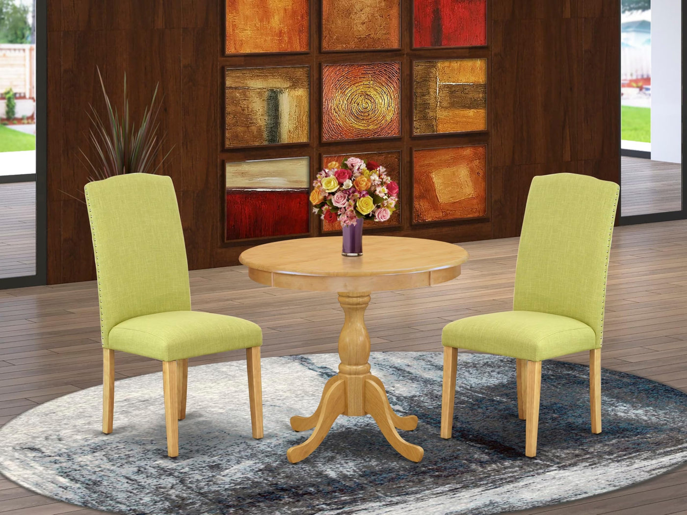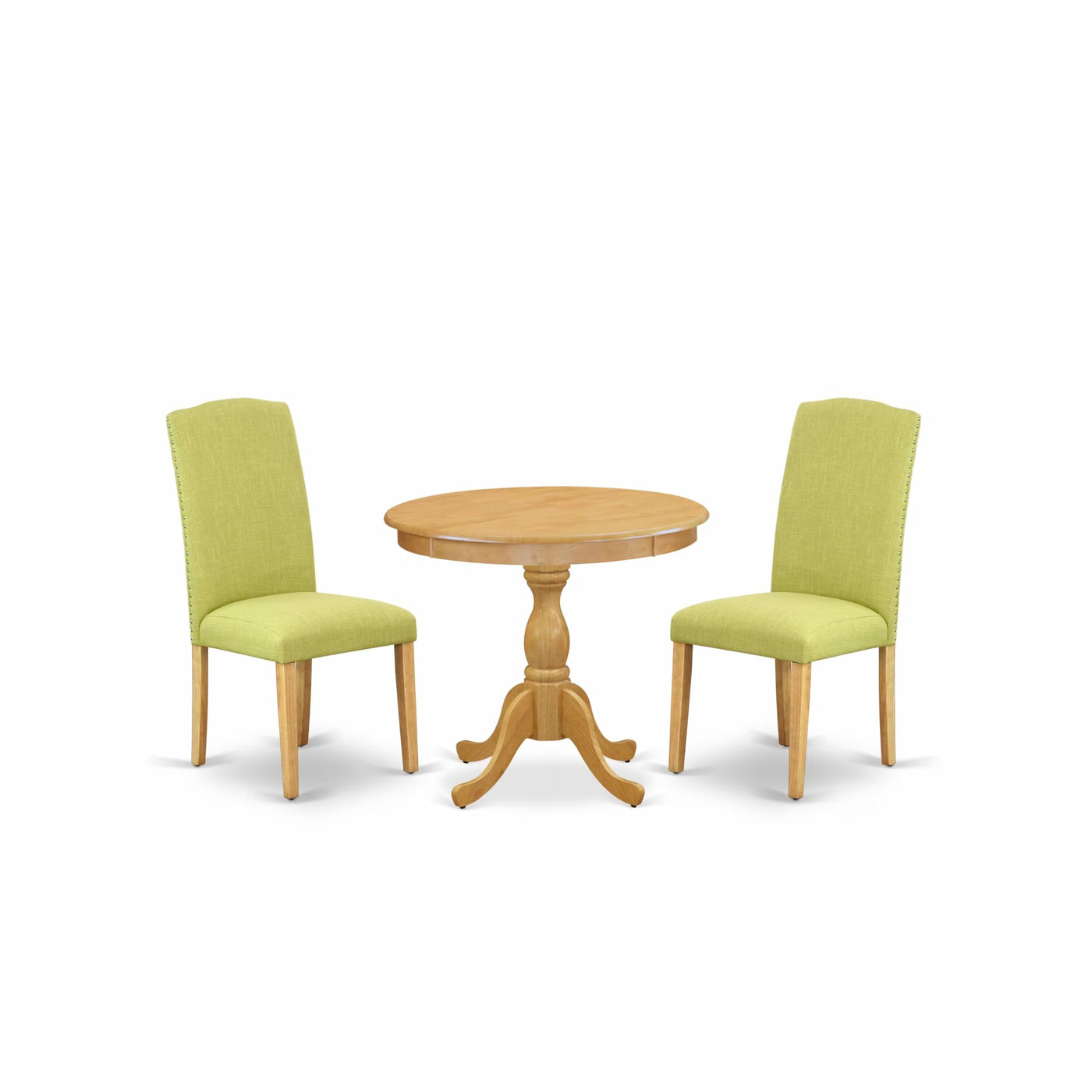 East West Furniture AMEN3-OAK-07 3 Piece Kitchen Table Set Contains a Round Dining Room Table with Pedestal and 2 Limelight Linen Fabric Parson Dining Chairs, 36x36 Inch, Oak
